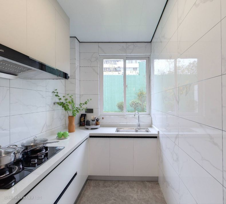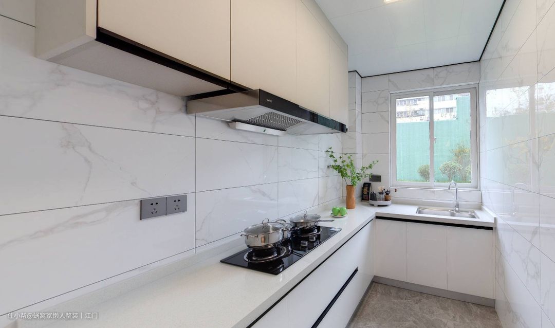 整排的白色收纳柜与吊柜为一体,加上厨房四周墙面通铺光滑的瓷砖,让厨房更加协调统一。L型的空间动线,让厨房洗切炒动线更加流畅,嵌入式的抽油烟机,节省了不少的厨房空间,还为厨房油烟排除预留了充足的空。