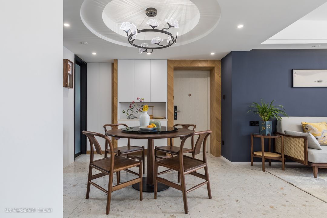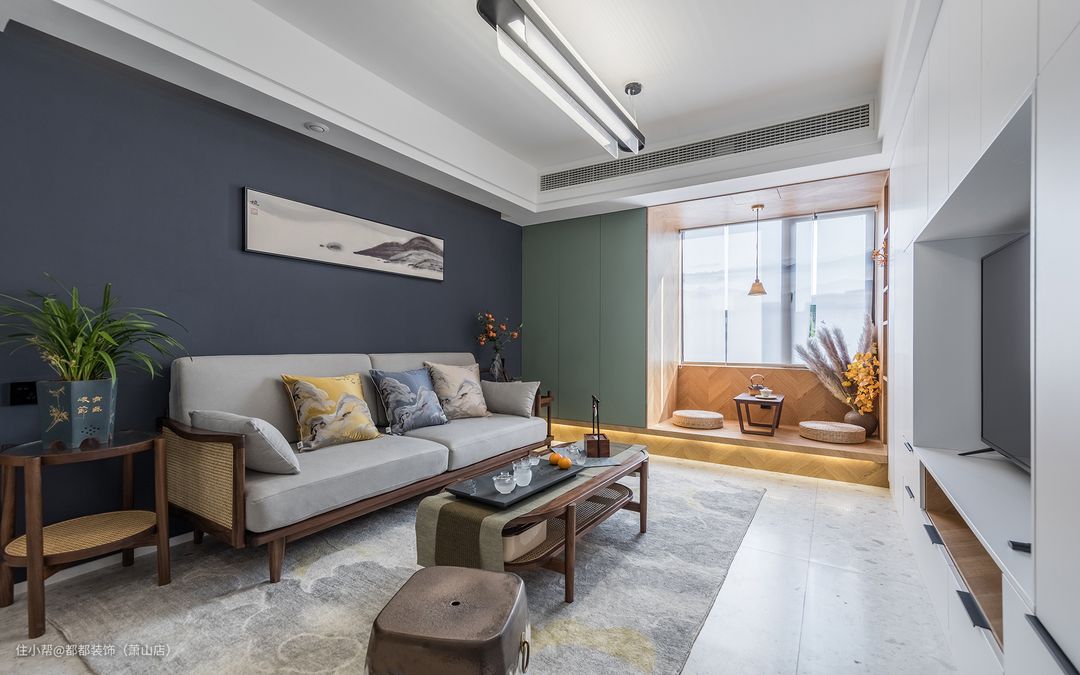 客厅整个空间以温馨的感觉进行整体颜色的把控,多采用白色、原木以及藏青灰来体现整个空间的气质。纵观整个客厅,既有中式的古典之美,又有北欧的清新田园气息,一侧背景墙选用普鲁士蓝为底色,就像古书的封面,为空间定下优雅的基调。