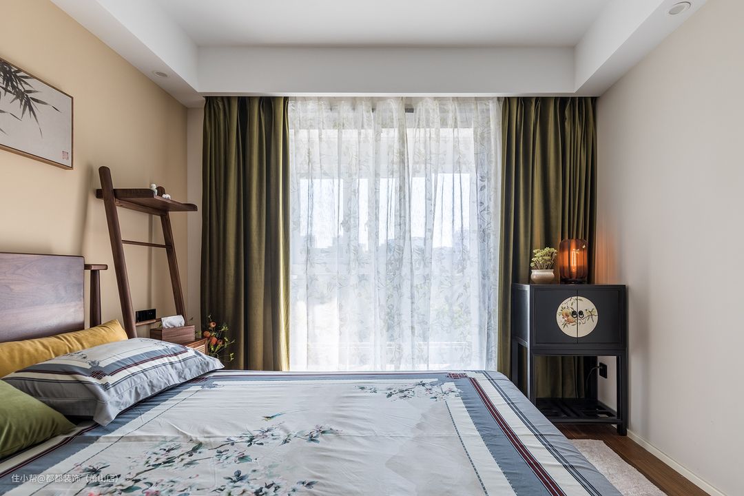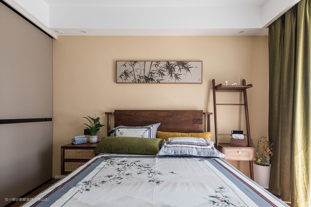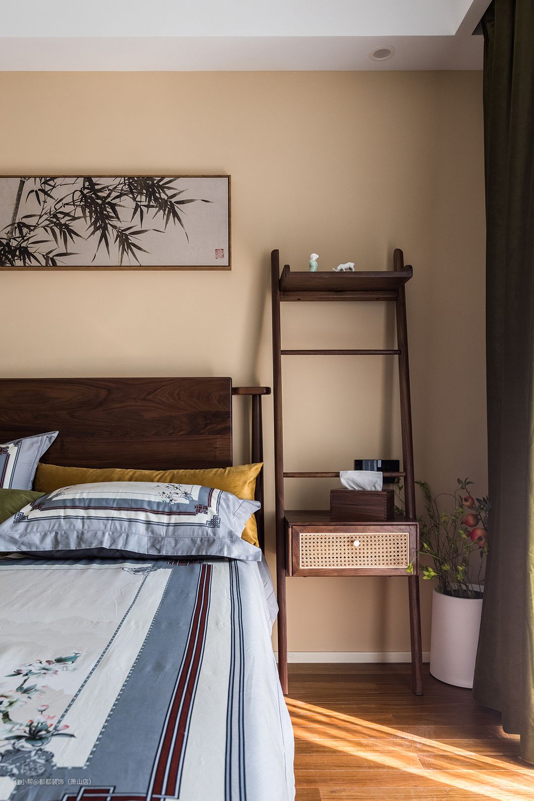 卧室优雅素净,木质家具摆件、草绿色的窗帘与床品、水墨竹叶壁画,在避繁就简的设计笔触中,款款诉说着纯粹的情思,于喧嚣一隅中寻觅质朴生活之道。淡黄色的背景墙中点缀竹墨画,给人一种寺庙般禅意的清净,石榴果实盆栽、白掌花、小多肉和琉璃灯,给刘先生一个没有束缚的独处空间。