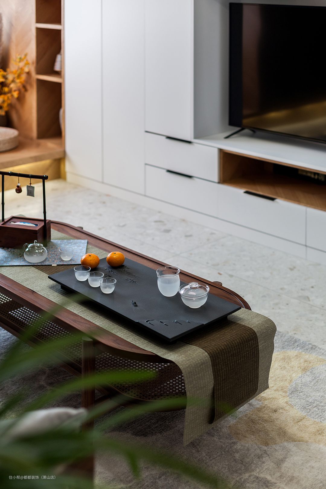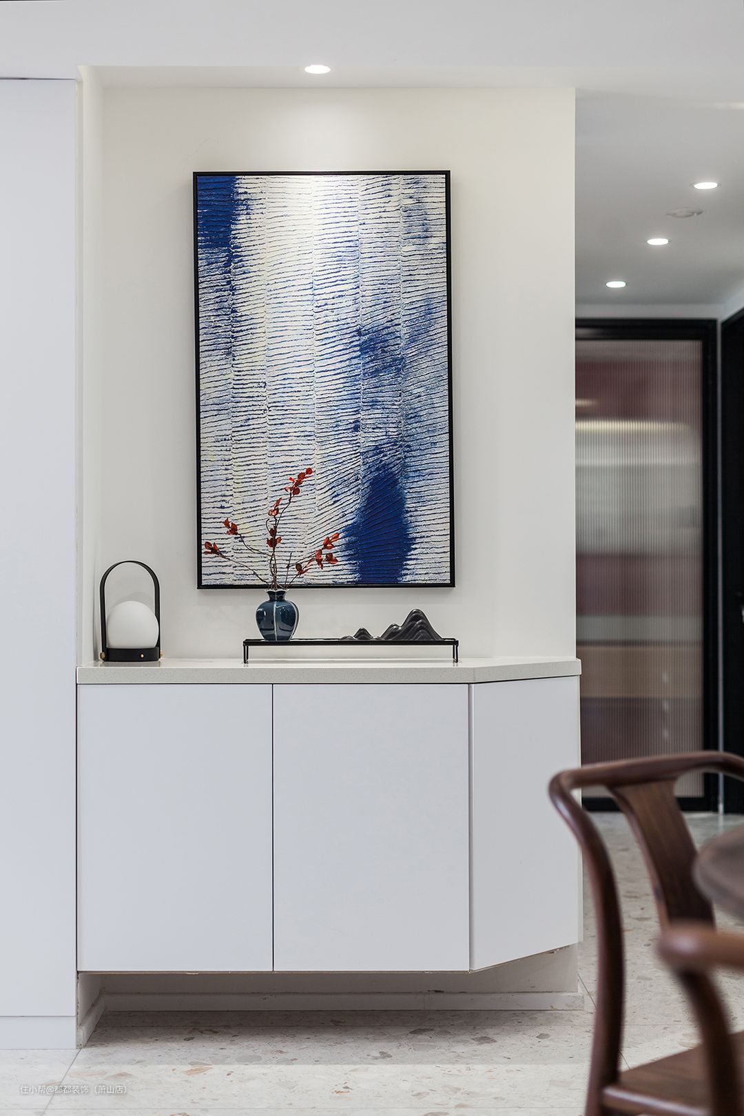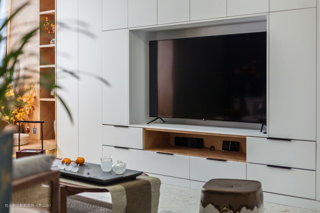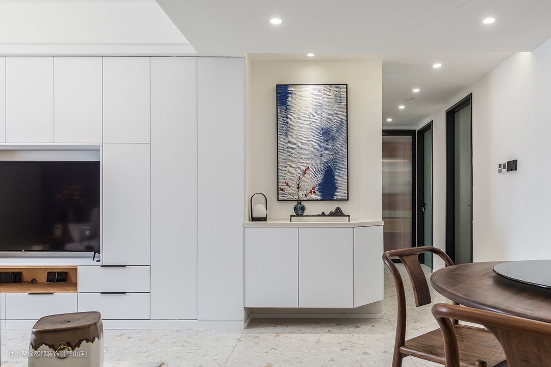 玄关没有单独留出空间,顺着电视柜靠墙打造一个悬空矮柜就形成了天然的玄关,梯形台面既避免了磕碰又有简约美。