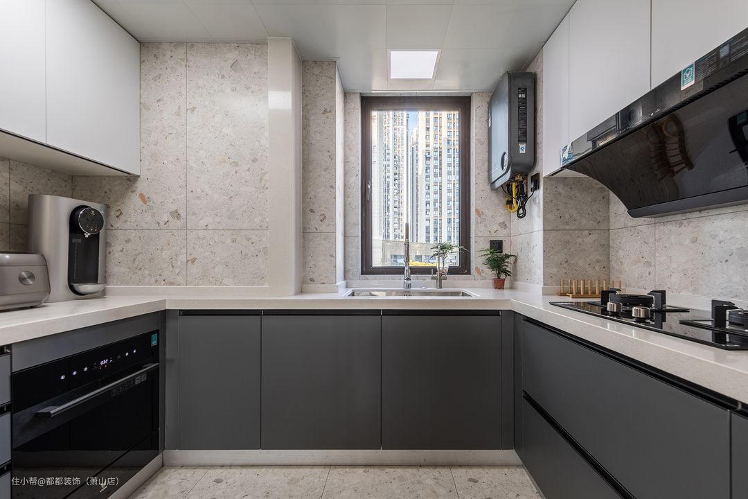 高级灰营造简约的视觉感,沉稳而内敛,水磨石的墙面让整体又有几分小清新的气息,在厨电装修上多采用厨电嵌入式,而在拉手的设计上选择隐形拉手。