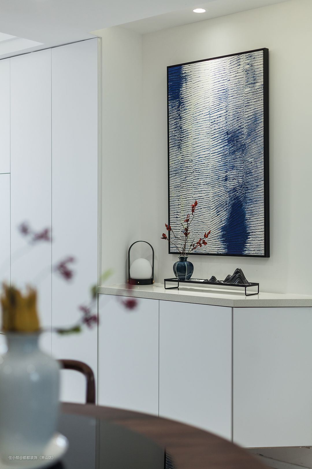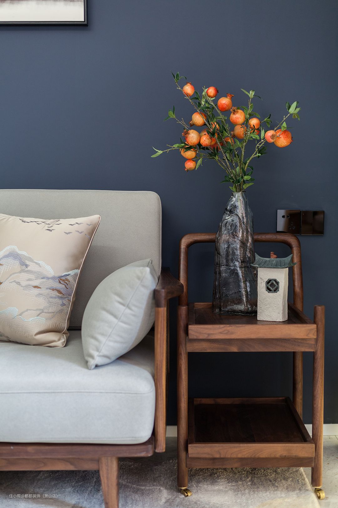 内嵌的电视机与储物柜设计成一体,既不占用空间又大大增加了收纳率,白色点亮空间。客餐厅无阻碍隔断,宽敞透亮,藏青灰作为沙发背景墙,沉稳内敛,搭配简约的水墨画,整体舒适整洁。沙发框架和靠墙茶几都选择了古朴的木质,再辅以石榴花、陶瓷摆件作为点缀,太有书香的气息了。木质家具总能带给空间温暖,饱和度高的橘黄色与纯净玻璃杯具相撞,丰富了视觉享受。