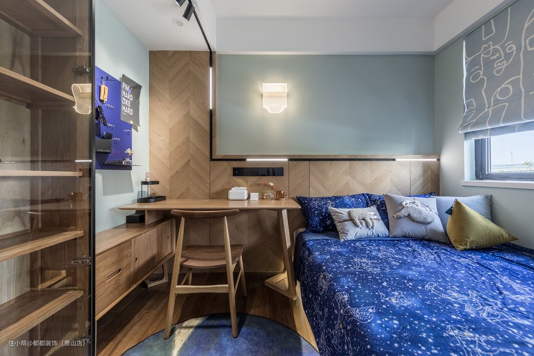 儿童房的设计围绕星空蓝,淡蓝色的墙面宁静,深蓝色的床品活泼,原木桌椅为孩子打造舒适的学习空间。