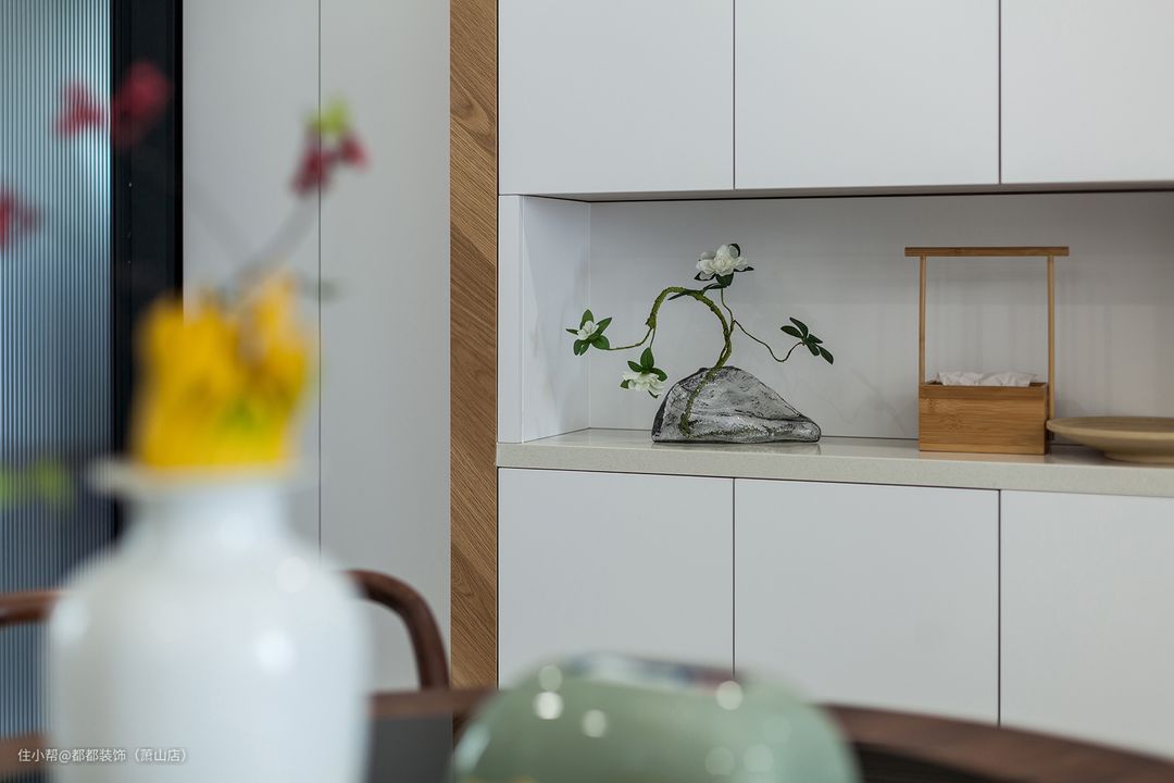 餐厅和厨房以一扇玻璃移门打破束缚与阻碍,带来空间的交流与互动,这边吃饭其乐融融,那边烟火人间,带来一种同生共融的和韵与温馨。