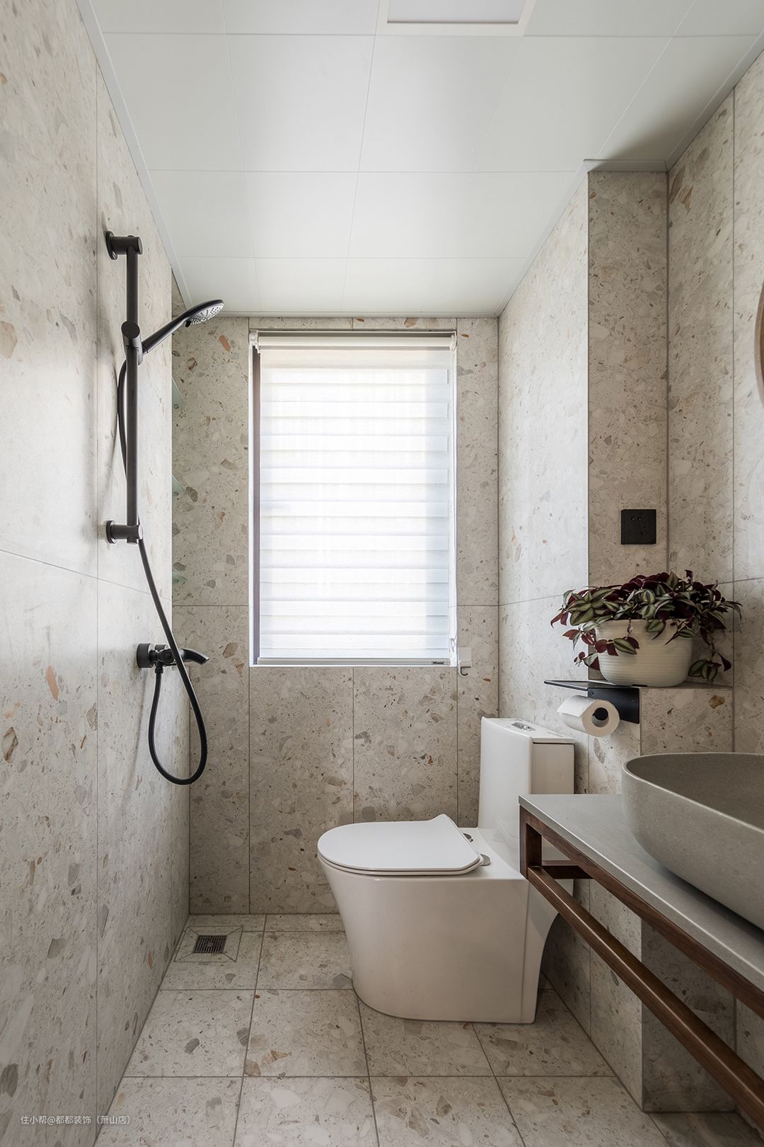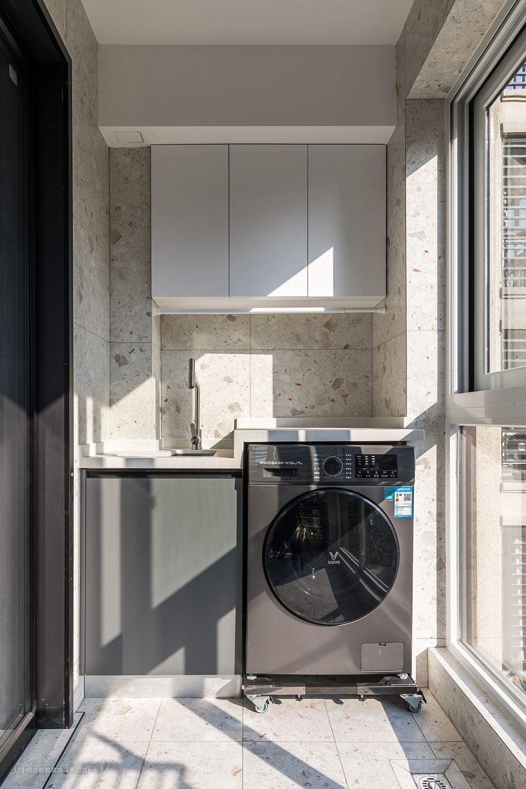 银杏叶盆栽、编织坐垫、质朴的瓶器演绎温润质朴的生活美学,得闲安坐其间,诗意淋漓间意蕴悠长。屋外是一个生活阳台,墙面和地面也都是水磨石材质,耐晒又防水,洗衣机下定制轮板方便移动。