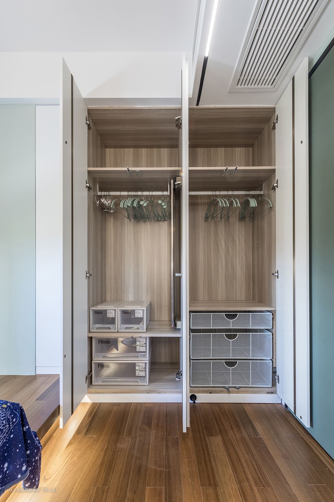 学习区设计感十足,绸带造型壁灯+L型条形灯潮流时尚,铁艺洞洞板搭配小钢针挂什么都不在话在,钉上铁板又是置物架,摆个香薰或者蜡烛都很合适。整墙的衣柜收纳力MAX,顶端放些被子枕头,中间挂平时常穿的衣服,下面放袜子、内衣拿取方便,全身镜也收纳在里面,出门前看看全身搭配,心情会好上一整天!