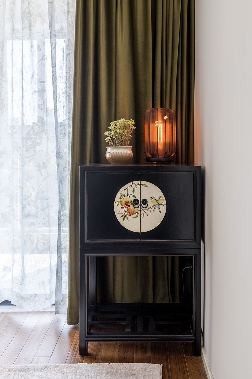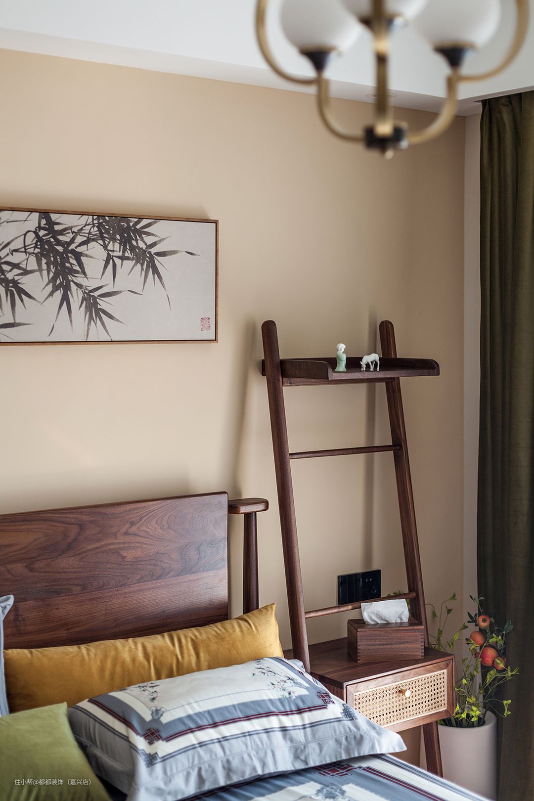 卧室优雅素净,木质家具摆件、草绿色的窗帘与床品、水墨竹叶壁画,在避繁就简的设计笔触中,款款诉说着纯粹的情思,于喧嚣一隅中寻觅质朴生活之道。淡黄色的背景墙中点缀竹墨画,给人一种寺庙般禅意的清净,石榴果实盆栽、白掌花、小多肉和琉璃灯,给刘先生一个没有束缚的独处空间。