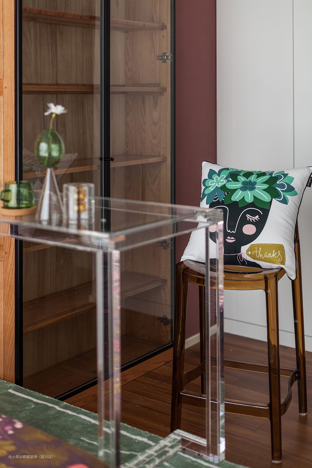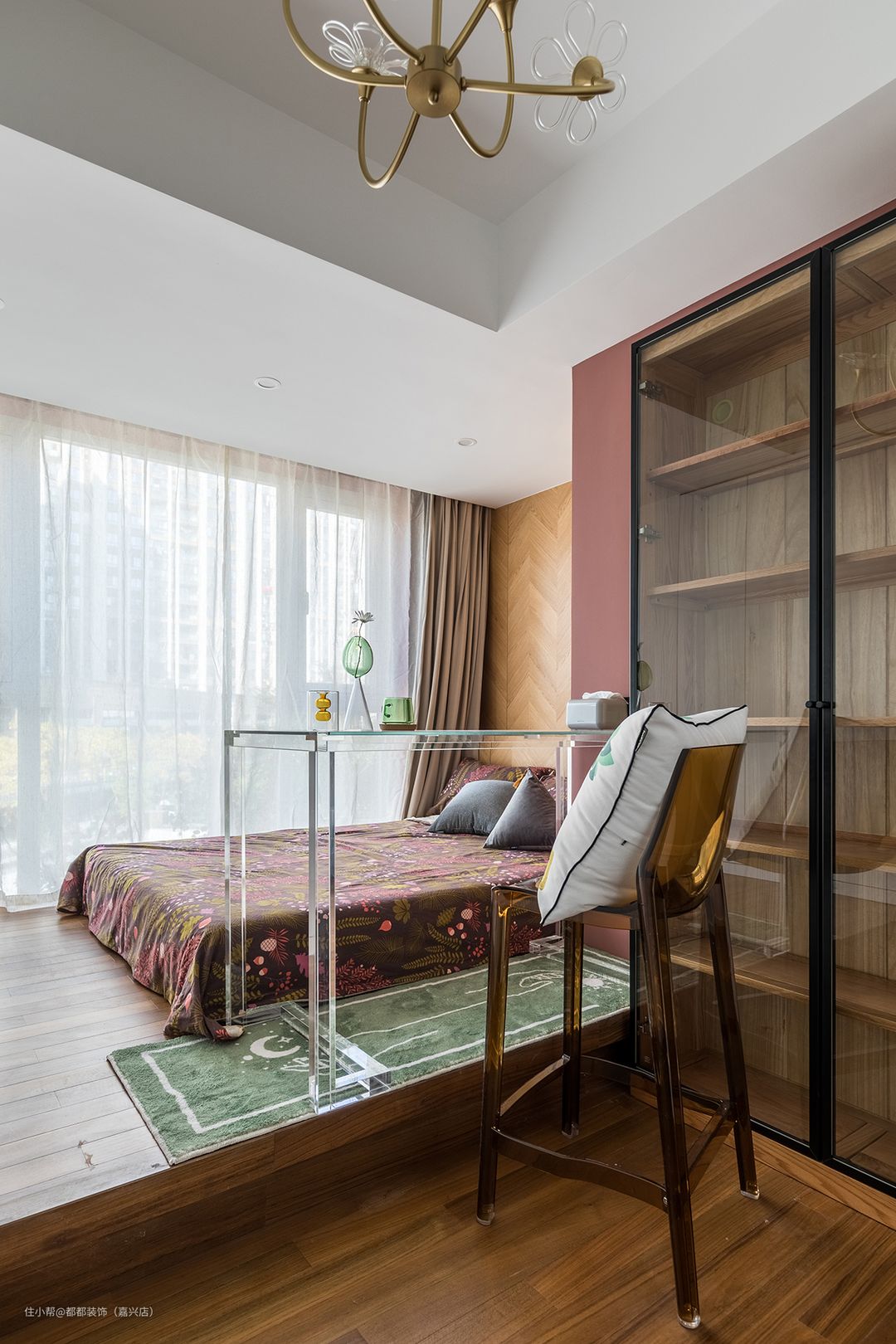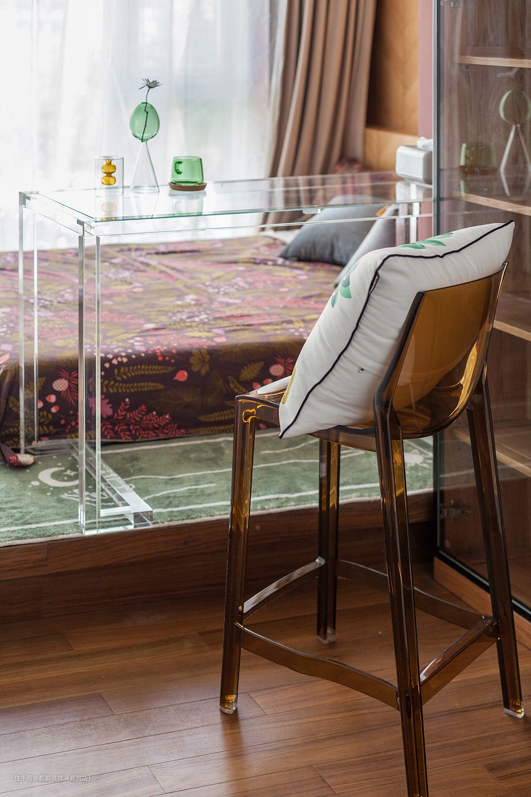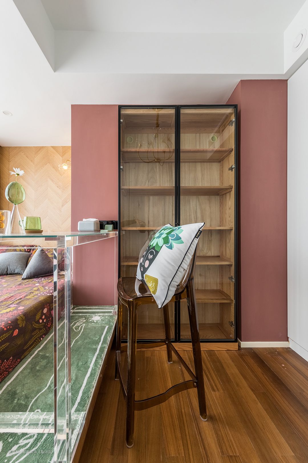 次卧采用高低错落的榻榻米,用色大胆丰富,豆沙色温柔沉静,透感的桌椅彰显流行的ins风,整体温馨舒适。