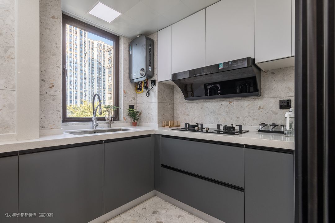 厨房白色与灰色相配的橱柜简约时尚,现代风厨房遵守简约的本质,没有累赘的设计但却将功能做到最大化。