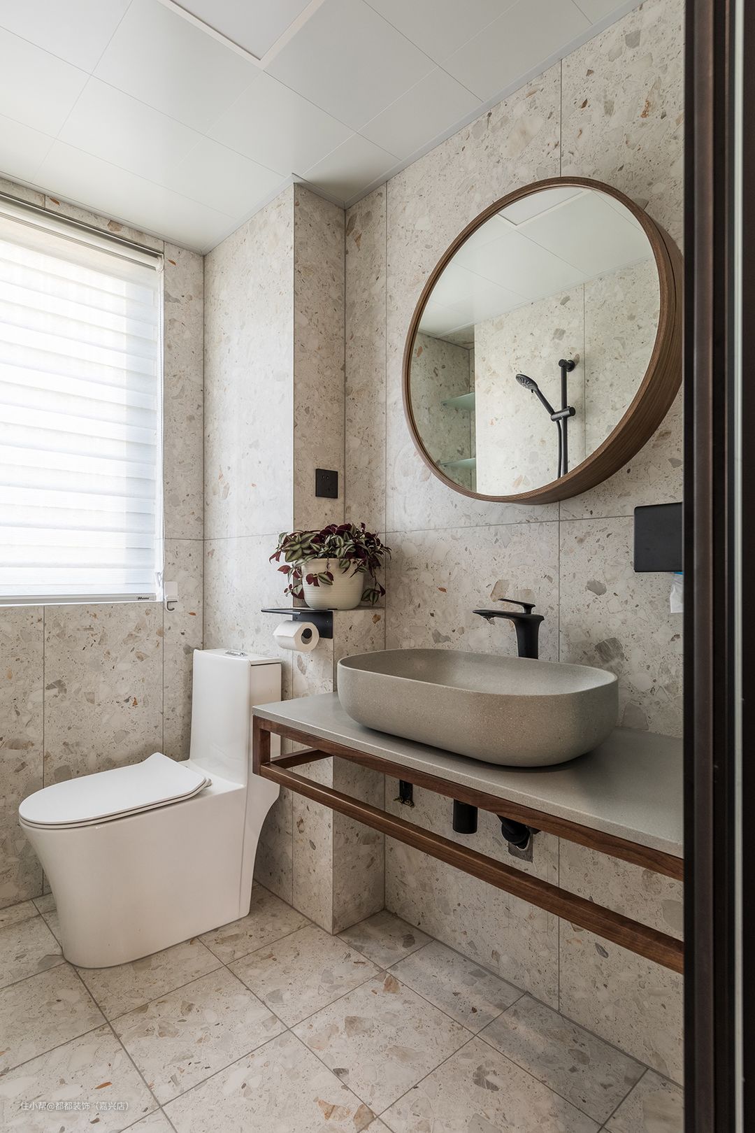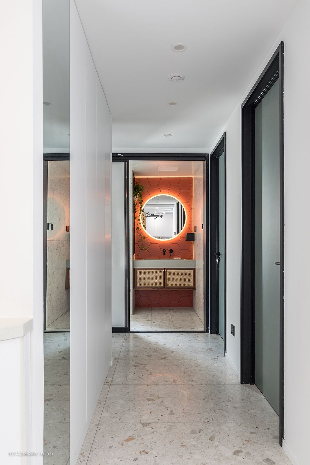 卫浴干湿分离,干区外是长虹玻璃门,推开门映入眼帘的爱马仕橙以灯光点缀,六边形小砖铺设浴室墙与洗漱台,垂挂的常春藤、亚光黑色水龙头,处处都能感受到浪漫主义的影响。三分离浴室,洗手台外移,兼顾洗漱、沐浴和如厕三大方面,让吊柜、壁龛、台面最大化的利用,貌美又实用。次卧卫浴花灰色主调,原木框圆镜、做旧感洗漱台,整体小巧但一应俱全。