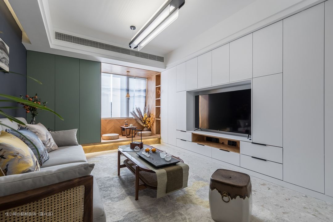 玄关没有单独留出空间,顺着电视柜靠墙打造一个悬空矮柜就形成了天然的玄关,梯形台面既避免了磕碰又有简约美。