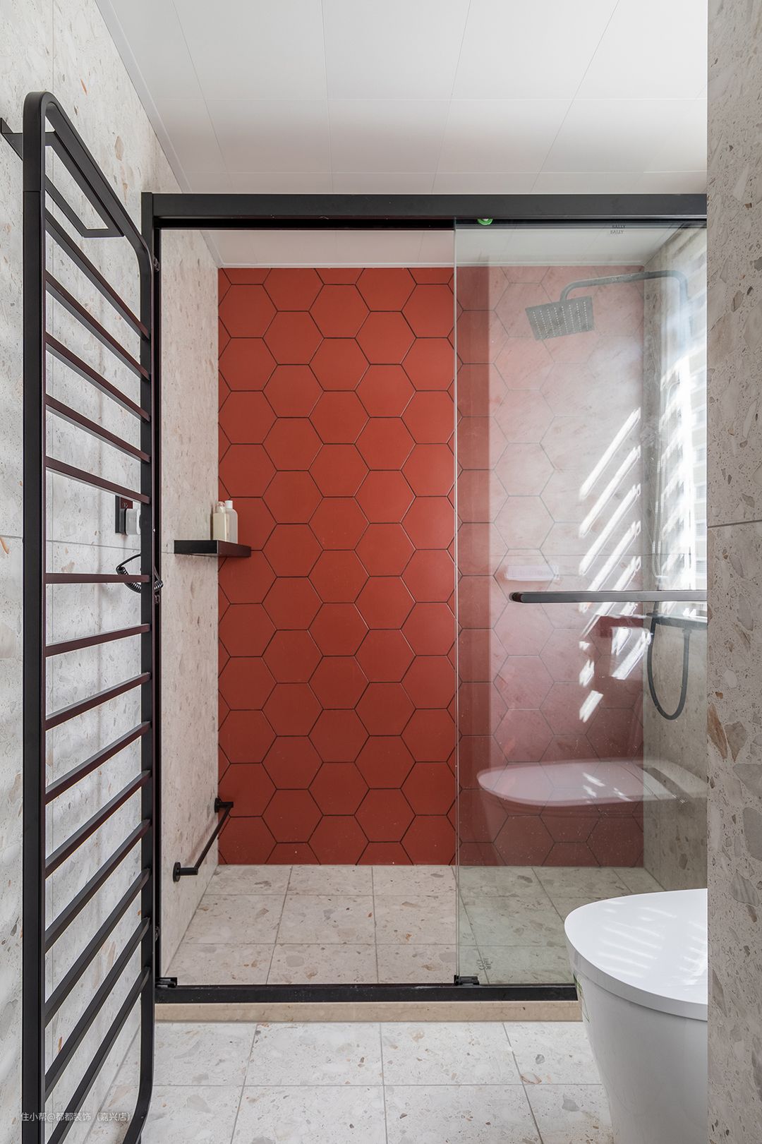 卫浴干湿分离,干区外是长虹玻璃门,推开门映入眼帘的爱马仕橙以灯光点缀,六边形小砖铺设浴室墙与洗漱台,垂挂的常春藤、亚光黑色水龙头,处处都能感受到浪漫主义的影响。北欧风总是自带一股粗犷的温馨感,摒弃了常用的白色,粗糙质感的地板+蜂窝型橘色墙面,视觉效果绝美。