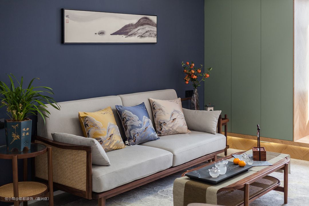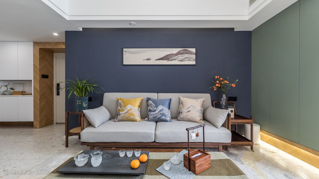 客厅整个空间以温馨的感觉进行整体颜色的把控,多采用白色、原木以及藏青灰来体现整个空间的气质。纵观整个客厅,既有中式的古典之美,又有北欧的清新田园气息,一侧背景墙选用普鲁士蓝为底色,就像古书的封面,为空间定下优雅的基调。