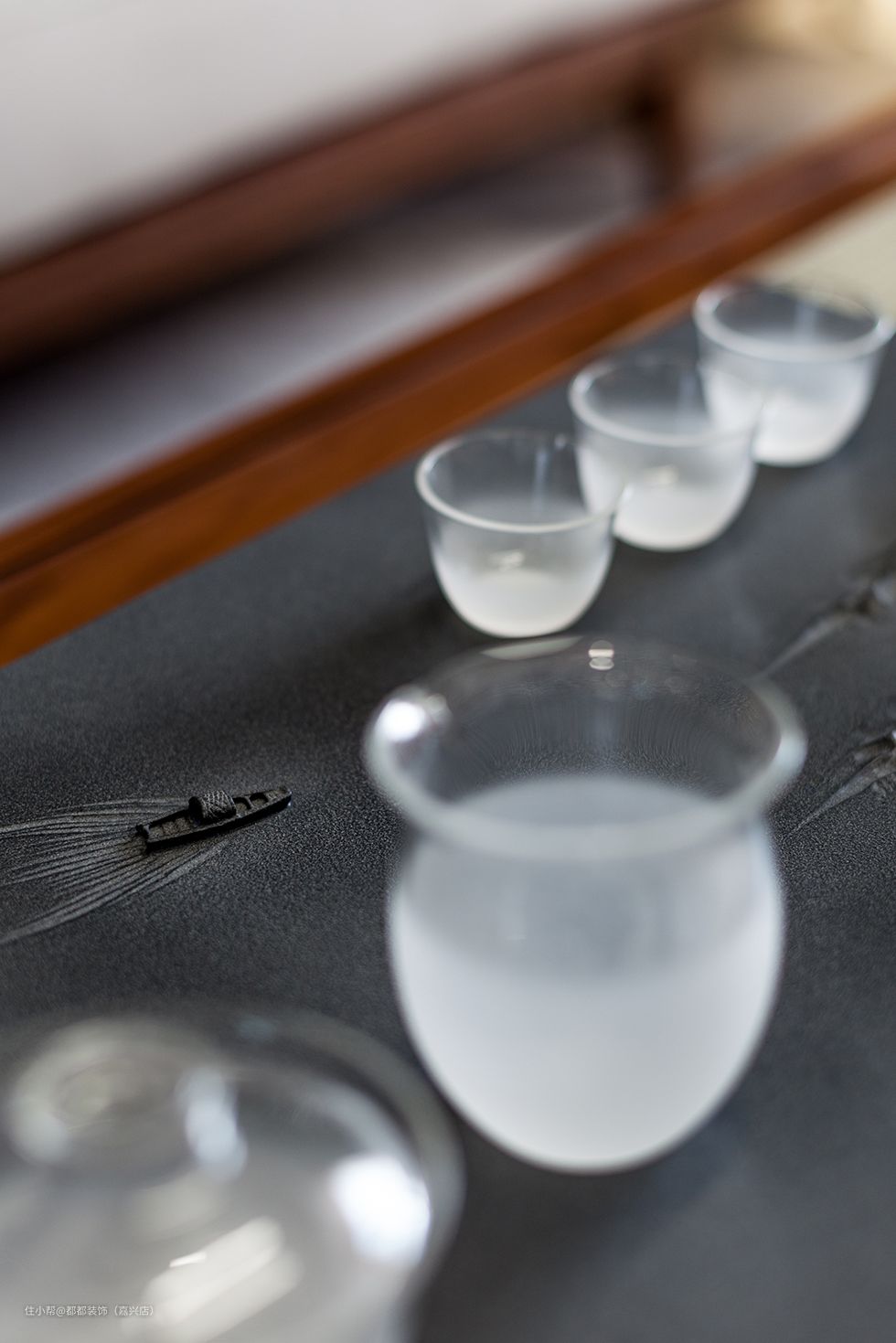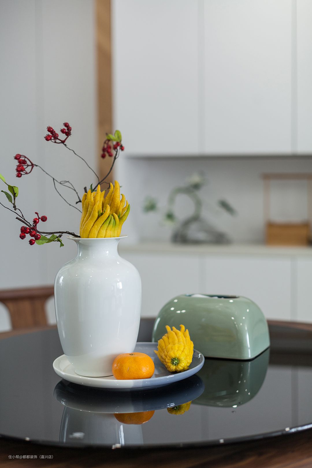 内嵌的电视机与储物柜设计成一体,既不占用空间又大大增加了收纳率,白色点亮空间。客餐厅无阻碍隔断,宽敞透亮,藏青灰作为沙发背景墙,沉稳内敛,搭配简约的水墨画,整体舒适整洁。沙发框架和靠墙茶几都选择了古朴的木质,再辅以石榴花、陶瓷摆件作为点缀,太有书香的气息了。木质家具总能带给空间温暖,饱和度高的橘黄色与纯净玻璃杯具相撞,丰富了视觉享受。