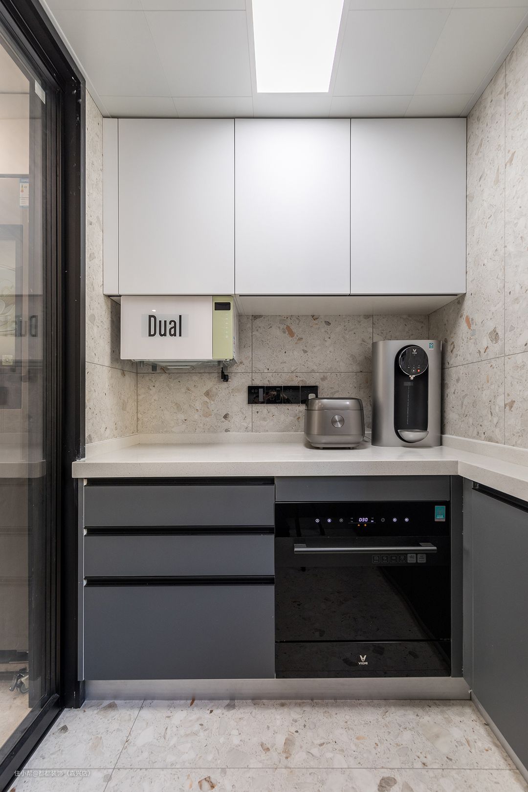 高级灰营造简约的视觉感,沉稳而内敛,水磨石的墙面让整体又有几分小清新的气息,在厨电装修上多采用厨电嵌入式,而在拉手的设计上选择隐形拉手。