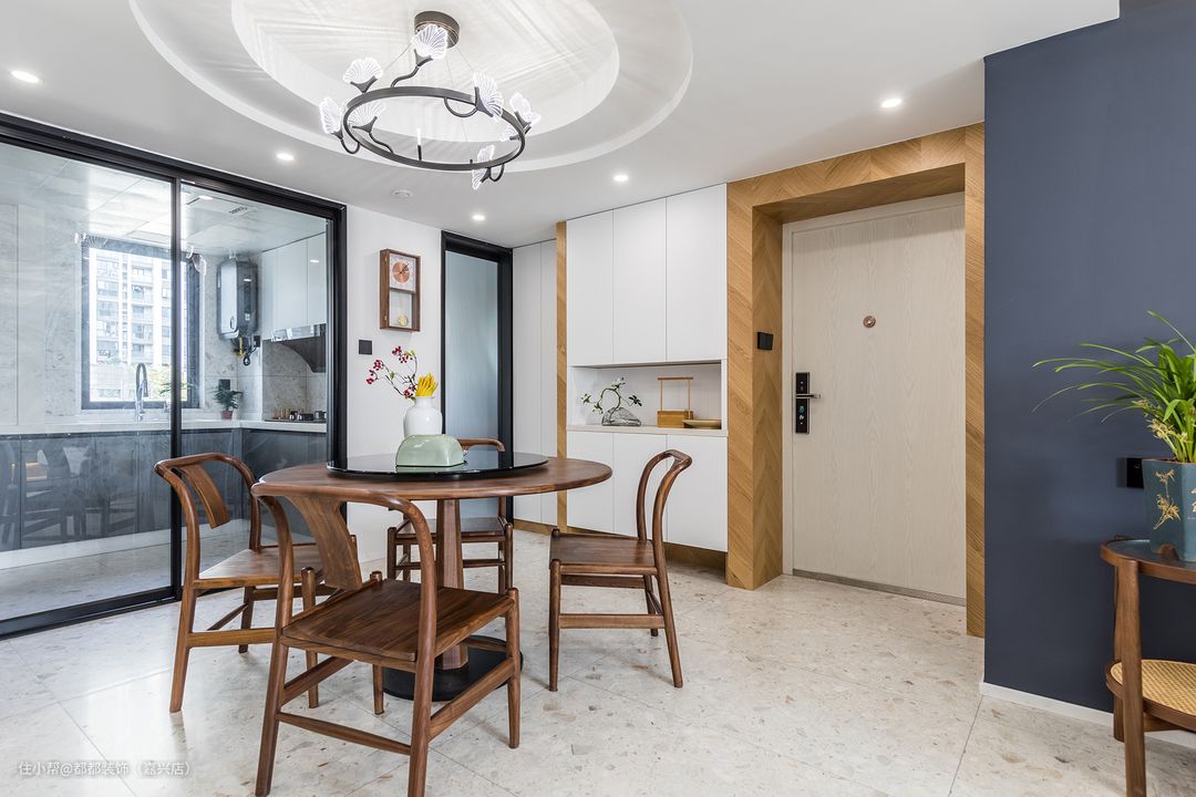 空间黑色的基调上,点缀以少许大理石的自然纹理,再辅以精致的水晶吊灯,让生活回归最纯粹的状态,灯火摇曳间,让家的温馨驻留心间。餐厅木质餐桌椅与客厅家居相呼应,胡桃木材质沉稳古典,大气端庄的中式美呼之欲出,白色顶天式餐边柜就像天然的幕布,将桌面上佛手、花束衬托的更加艳丽。