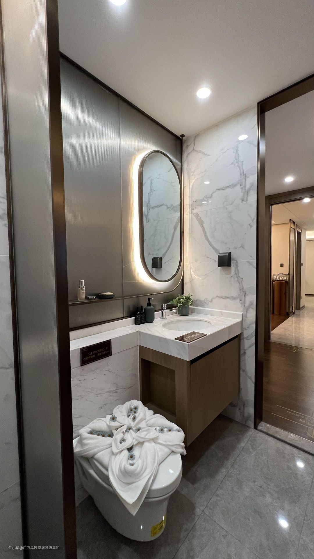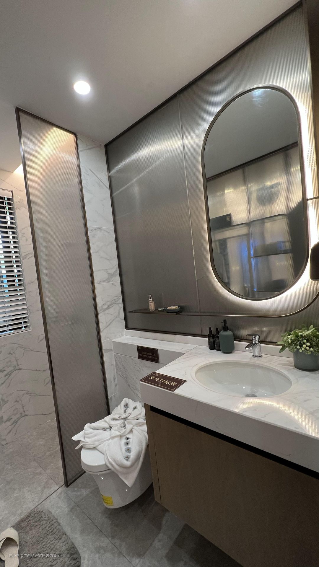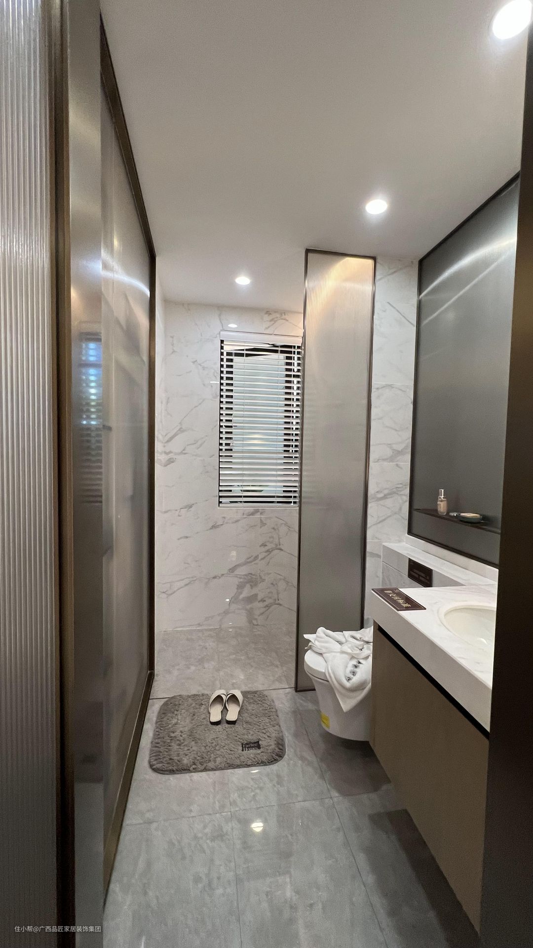卫生间采用淋浴间做隔断,增加了私密性和实用性。淋浴区域采用了大理石瓷砖,增加了整体的豪华感。卫生间里的洗脸盆和马桶均选用简约时尚的款式,增添了整个卫生间的时尚感。同时,柜子也选用了现代简约的款式,增强了卫生间的整体时尚感。