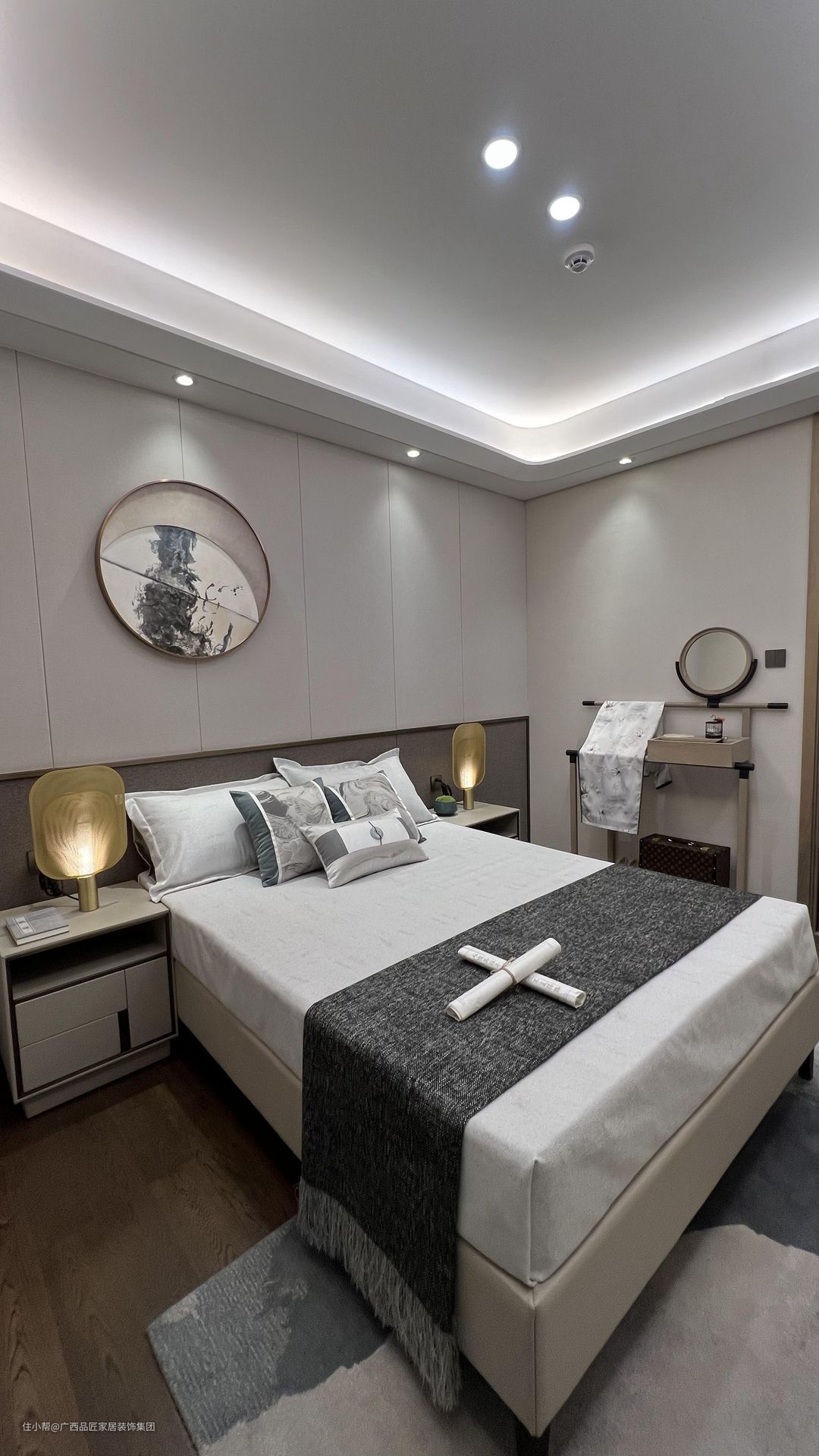 主卧是私人空间,所以更注重舒适性和个性化的设计。简约的现代化风格与中式元素相结合,给人一种既舒适又有气息的感觉。床头的壁灯充分考虑了光线的温暖感,让整个房间的氛围更加温馨。在床头的墙面上加入了书法作品的装饰,给整个房间增添了文化的气息。