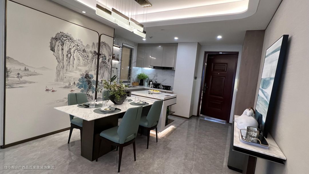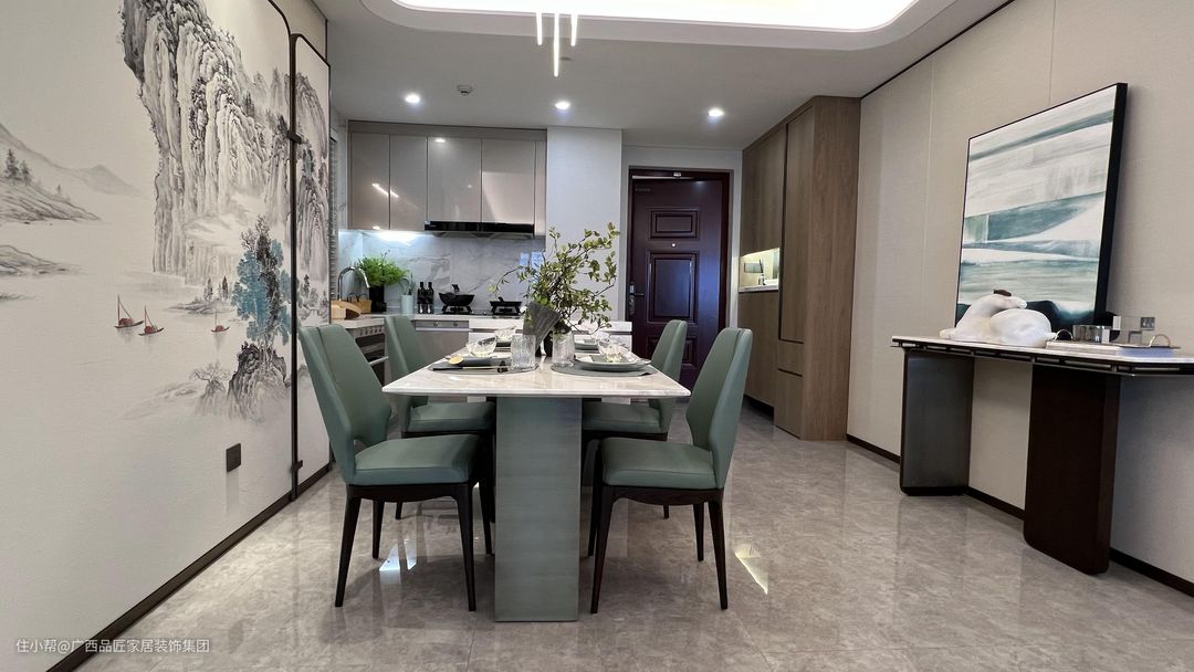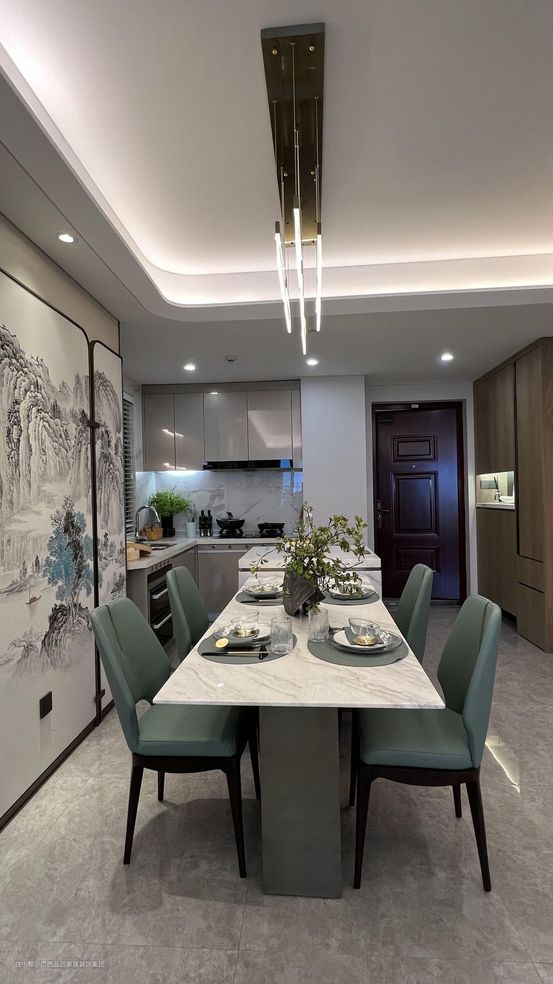 餐厅与客厅共用一处空间,但是在装饰上并没有被忽视。简洁的餐桌与椅子搭配,让整个餐厅更加精致而优雅。在餐厅墙面上放置了一些巨型绿植,不仅能够起到装饰作用,同时也起到空气净化的作用。墙面的护墙板采用米色麻纹设计,与客厅的装饰风格相呼应,整个空间协调统一。