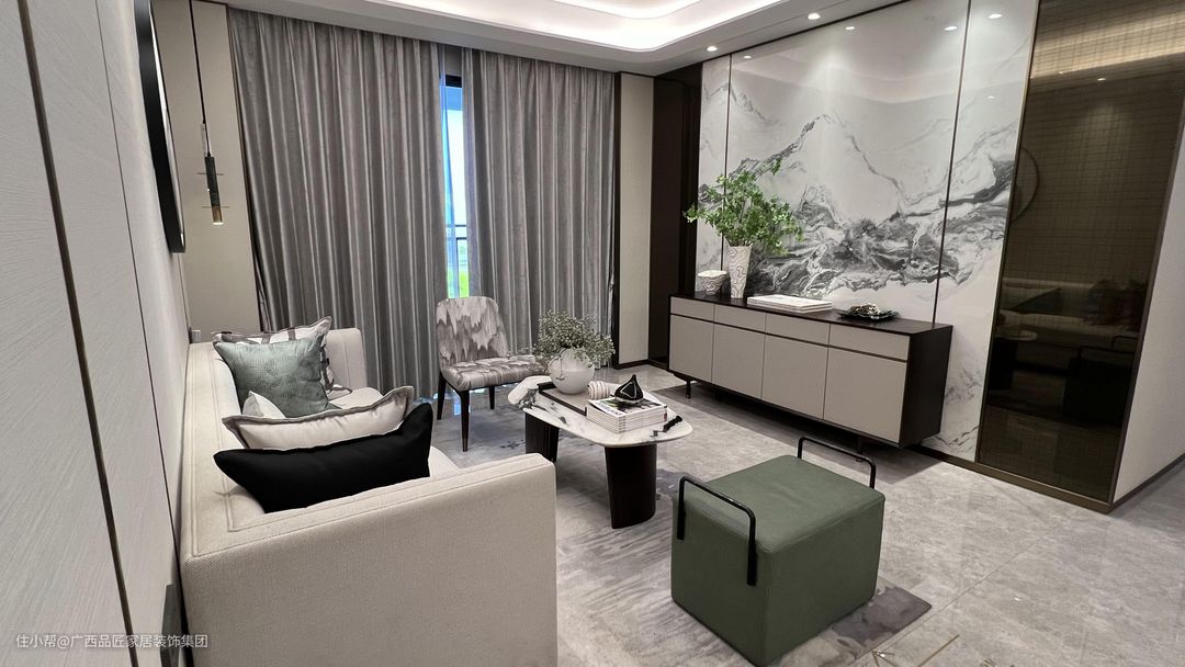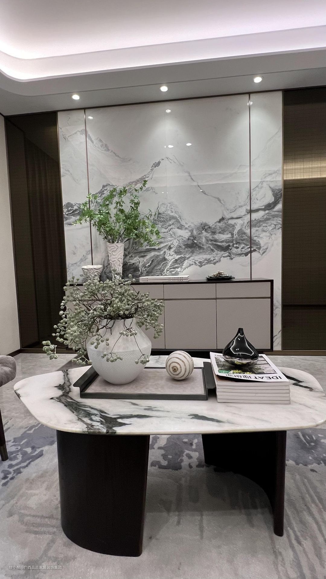 阳光透过落地窗照在护墙板上,点缀出光影交错的装饰,一盏盏线灯将视线引向天花的简约边吊,简洁而大气的设计让整个空间更显宽敞明亮。白色布质沙发与米色地毯的搭配,让客厅舒适的氛围尽显无遗。在墙面选择了山水墨画的背景墙,更加突出了现代化的艺术气息。