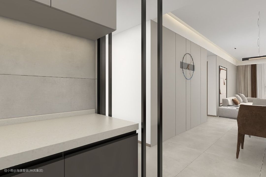 吊柜和下柜选用不同色,更加现代风,墙砖也选用明亮的浅色,提升厨房亮度。橱柜选择深色使整个厨房更有层次感,将厨卫用品与橱柜融合成一个体系,色彩搭配灯光照明进行最大的简化,可以起到很好的视觉效果。
