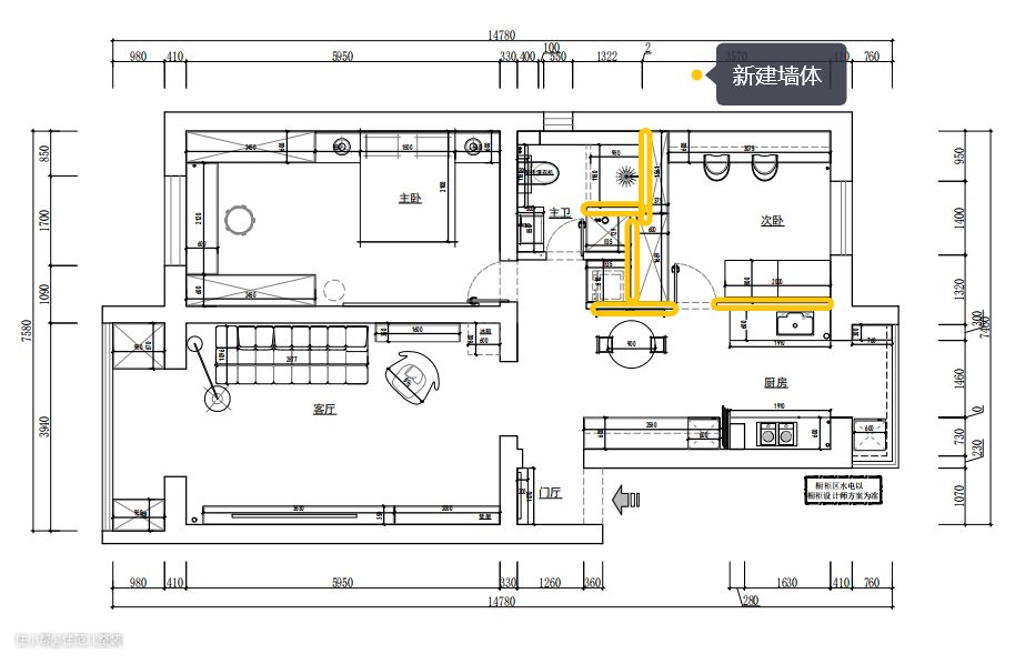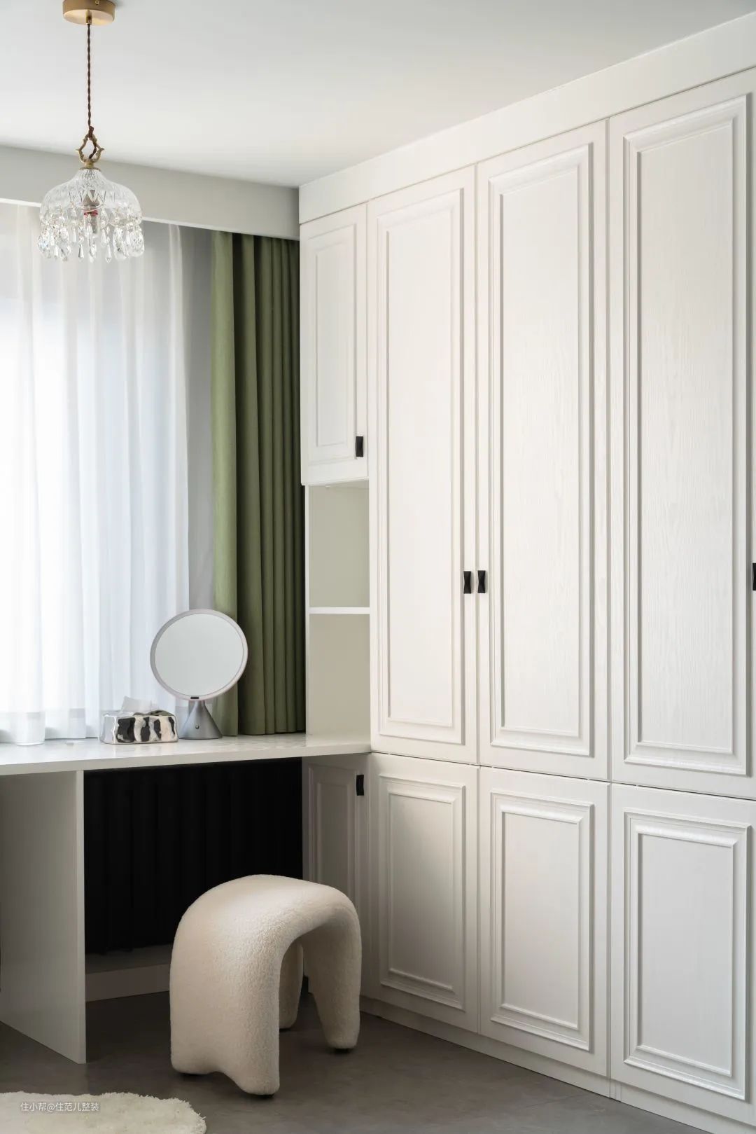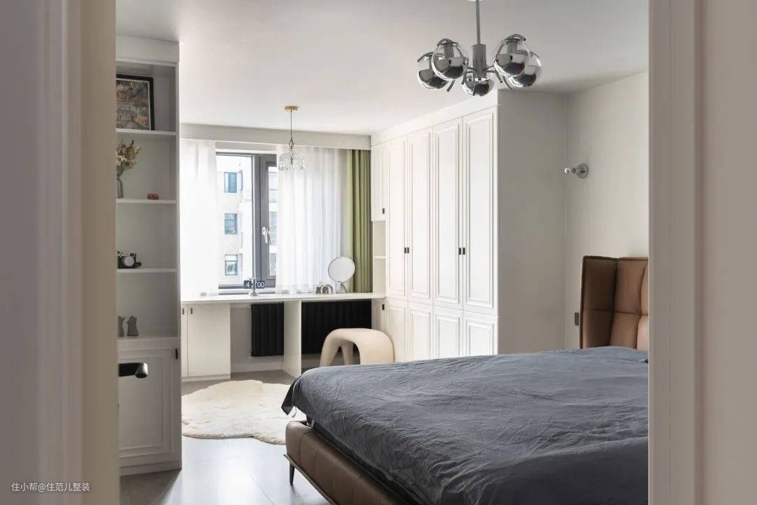客厅隔壁就是主卧,这个空间,他媳妇做主。 两人都是喜欢交朋友,又需要彼此隐私的性子。按照当前的规划,卧室大多数时间,都属于媳妇,“我只睡觉”。 确定以及肯定的是,女孩子都有个“衣帽间的梦”,她媳妇也不例外。 从面积上看,主卧和隔壁客厅是一样大的,设计师从功能上将空间一分为二,一半给了衣帽区,一半给了睡眠区。 这样设计的好处有两点: 第一,衣帽区+化妆区沿墙而做,且靠着窗边,方便女屋主在自然环境下看自己的装扮,更自然,加上主卧隔壁就是卫生间,动线也不远,出主卧就≈整理好自己了; 第二,女屋主喜欢追剧,但小王喜欢游戏;不论是白天两人分开玩,还是晚上一起追剧,都不冲突,投影仪也不用移来移去,保证了女屋主的局部隐私性。 我测试过了,这种动线布置,在白天不拉窗帘的情况下,投影仪显色度和亮度完全没问题,省去了要拉窗帘的麻烦。 这里有个“交叉需求”的部分。按照原计划,卧室就该按女屋主喜欢的风格来,但小王同学看上了床头金属材质的灯,和女屋主喜欢的“轻法式风”不搭,两人在此稍有分歧。 为此,女屋主做了一点妥协,床头灯可以由小王选,但床由自己选,两人各退一步。 装修中这样的情况不少,对于分工的部分,减少分歧常见的方法是: 硬装、软装部分分别交给一个人主导,另外一个人给意见;或者全程一个人主导,另一个人提前沟通好想要什么,如何实现就别管了。