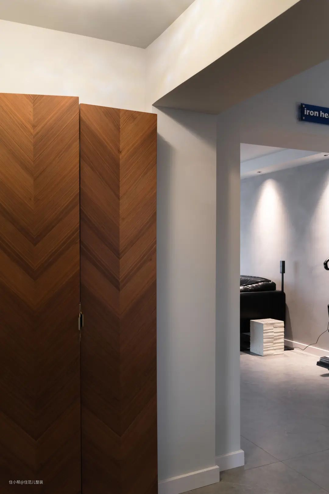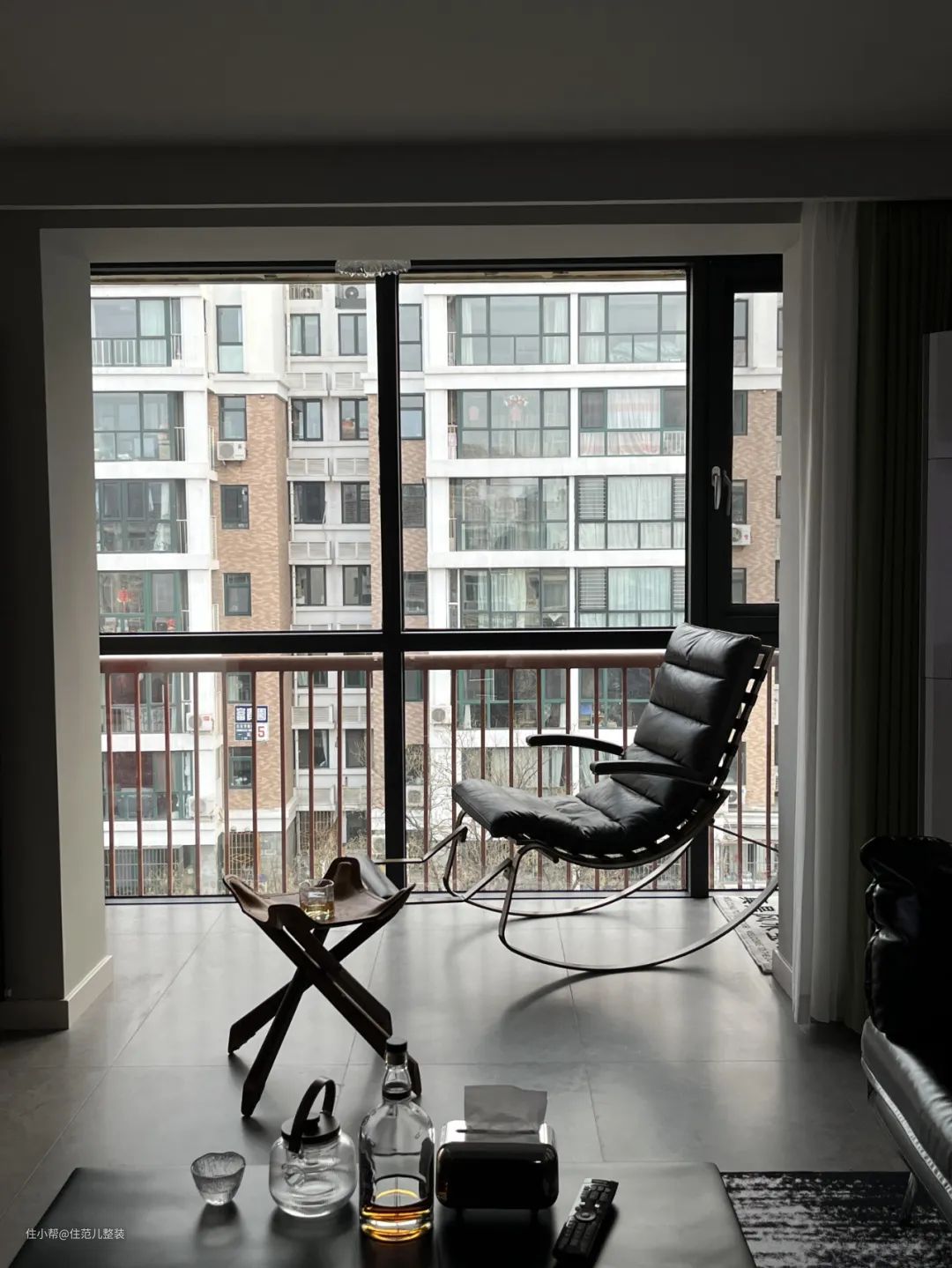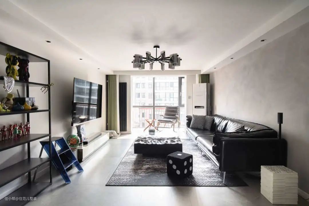 打开门,通过玄关后,却是“柳暗花明又一村”的感觉: 午时刚过,阳光通过窗户斜斜地洒在阳台上,有种迎面而来的炙热感,褐色的摇椅旁放着一杯清茶和一瓶洋酒,恰好 ,客厅正盈盈绕着我听不懂的法式音乐,慵懒而惬意,爬顶楼的气踹也在这一刻烟消云散。 屋主小王,等我们的同时也在听音乐,他是我采访真实人家这两年来少有的“影音爱好者”,穷自己不能穷耳朵,杜比特音效、电视画质他张口就来,他家装修在这点上,也不含糊。 作为婚房,也是首次装修的小白,小两口在装修前就达成一致意见:各自常待的空间各自负责,交叉部分小王来,硬装部分,交给拥有30年工装经验的找小王爸爸。 就这样,经过一通对比后,住范儿角逐胜出。让小王最终下定决心的,用他的话说两个原因,一是整体对比来看,设计细节的实现完成度比较高;二是家电选配的服务很打动他。 那他家究竟是什么样子? 按我的理解,就是工业、朋克、轻法式再融点日式,很难用“所谓的风格”去形容,但“真的很小王本人”——硬核中带点温柔,和可爱。
