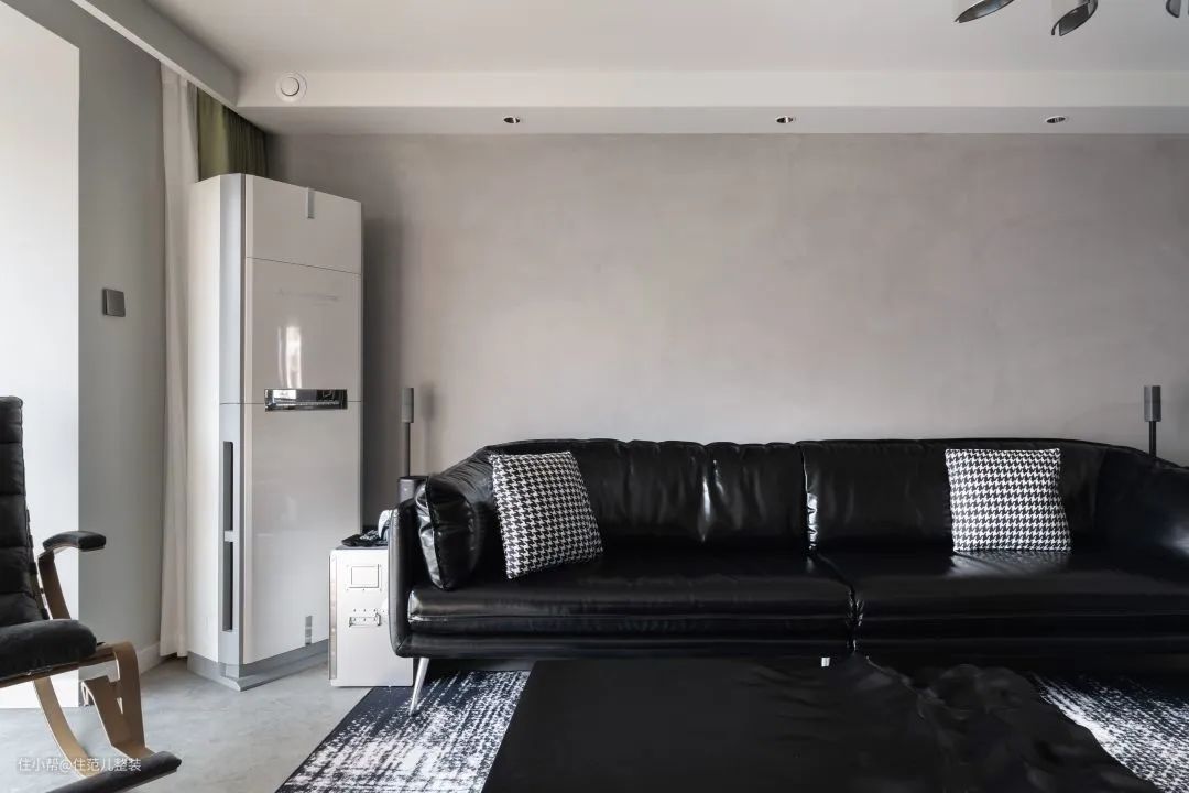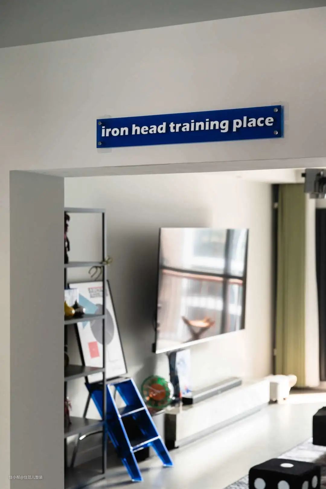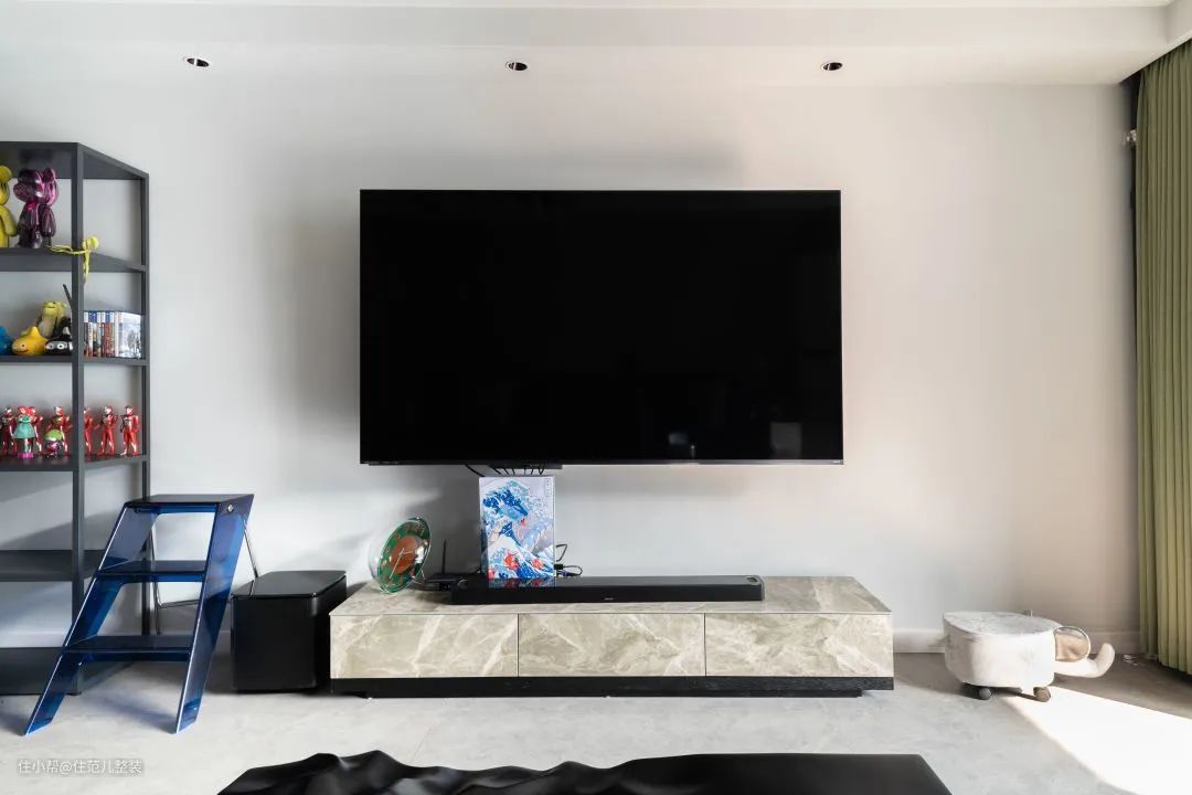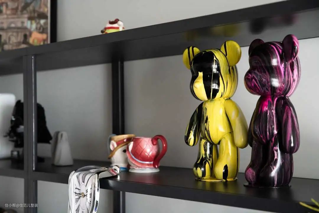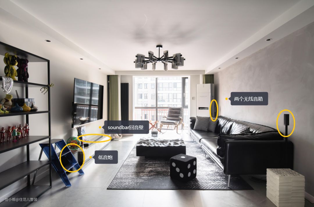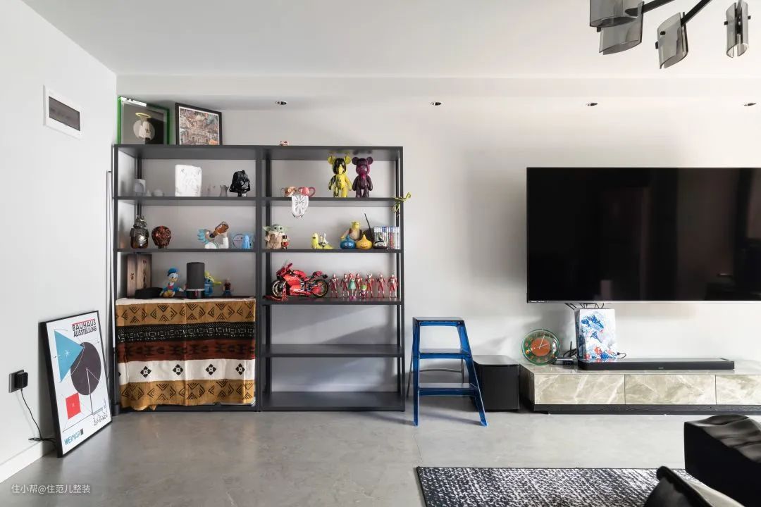 用“空而有料”来形容他家客厅最好不过,墙上挂着的是他精选的海信电视,4k可以轻松实现,这是他在放弃索尼之后的选择,“索尼有点贵,但海信稍微追一追索尼,它有自己的处理芯片,在快速移动的游戏人物里,它表现也还可以。” 前提是,必须配着它的音箱一起听,贼刺激! 影院的效果之所以逼真,就是在“视听”两方面更极致。受预算限制,他把重点放在了听上,在海信电视下方以及侧边,以及正对电视的左右两侧3m处,共放了4个音响,不同位置的音响作用不同。 这就相当于,在播放同一音乐的情况下,有5个音轨再给你的耳朵播放,高中低,左声道、右声道等各司其职,听起来层次丰富,细腻而有质感。 我随机播放了一段交响乐,现场效果真不错! 为了配上它的设备,他在风格上一早就有自己的想法,工业风。从落成的效果来看,实现度接近90%。 全屋通刷灰色的ppg漆作为底色调,这成为各个空间的连接色。客厅一改往日温馨的原木风,大胆使用黑色作为主色调,定制的黑色皮质沙发、黑色不规则茶几,配上角落hey的黑色细脚置物架,细看有材质碰撞的质感,也有黑色带来的“大气沉稳”。 白色固然干净,论质感,还得深色出击。 至于这吸睛的蓝色小板凳和玄关进入、门洞上这印着“铁头功”的蓝色小贴牌. 一是为了中和黑白灰带来视觉上的“沉闷感”,适当换一换,二是为了方便拿东西,以及提醒高个子的人进入客厅小心碰头,碍于是顶楼承重梁的原因,进入客厅的门洞只有1.9m,小王就曾深受其害。 角落的细脚置物架上,是这几年被他压在箱底的摆件,蛮可爱的。但有一说一,就他俩这情况,收纳肯定不够。 小王同学是这么考虑的,既然想为理想买单,就适度取舍,当下美和质感享受就够了,边生活边添置,把补充带来的“满足感”不断延迟,也没什么不好。