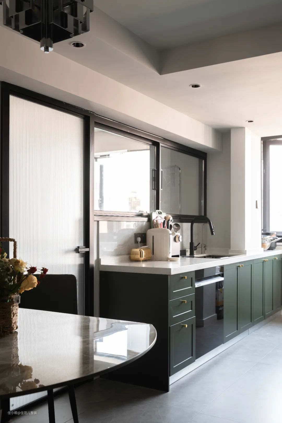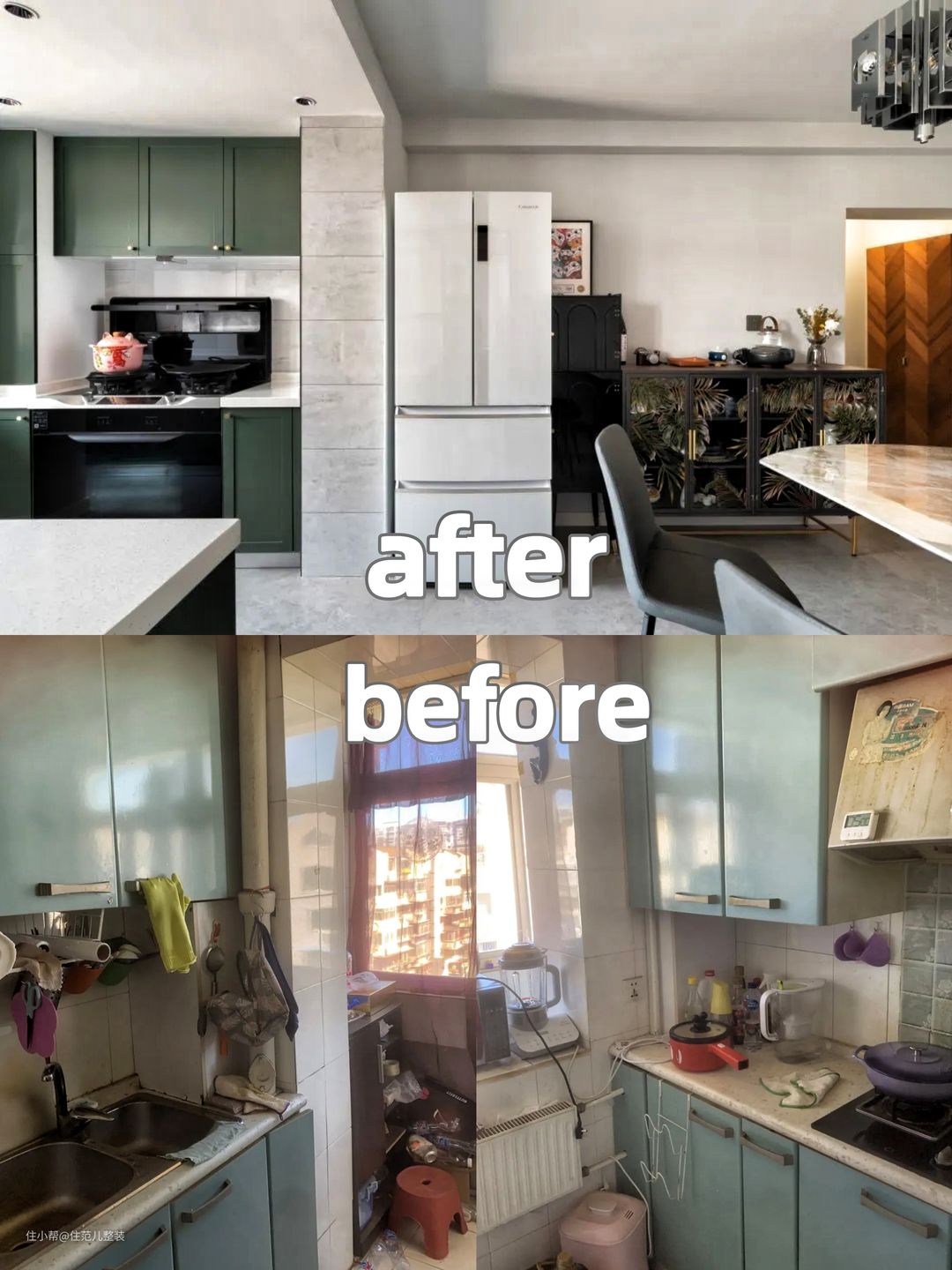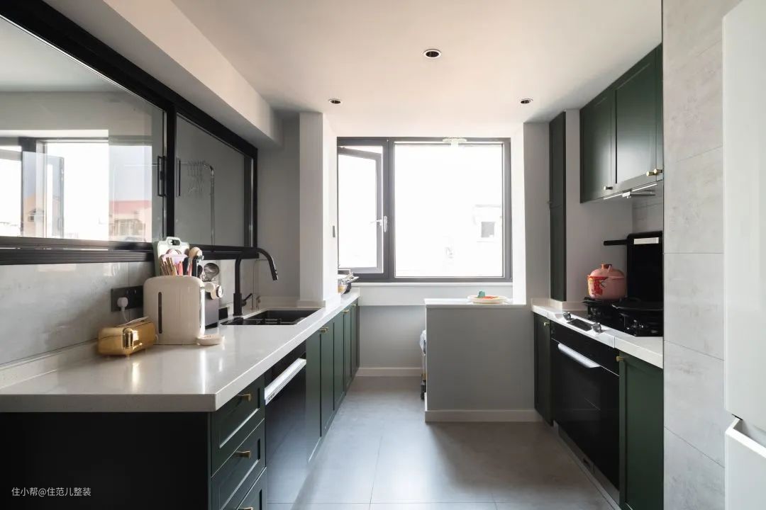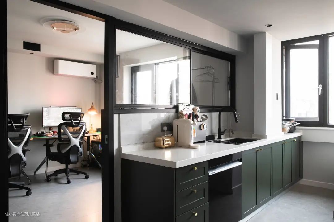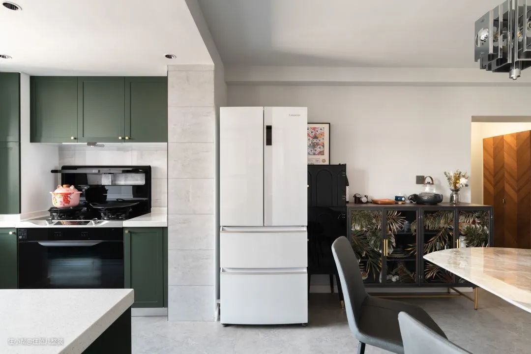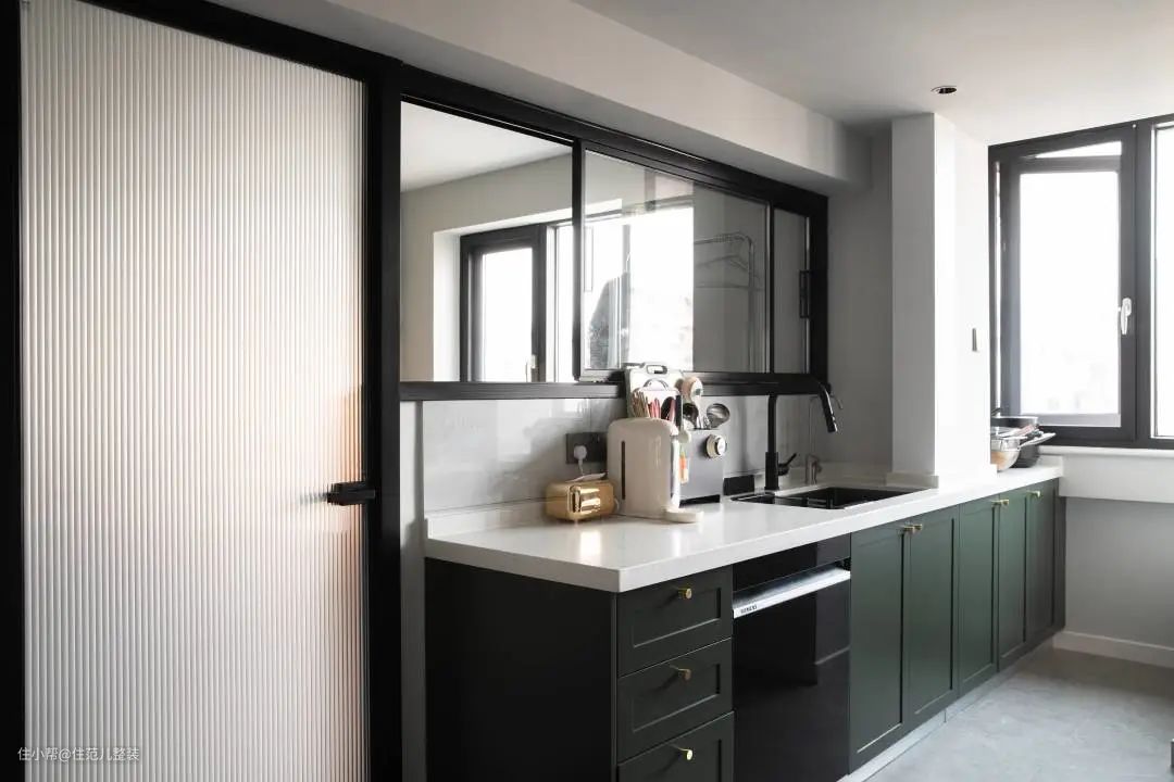 从卫生间出来,就是整个家庭的第二个公共核心区,也是需求交叉点。 这部分的分工里,格局和餐厅设计部分,由小王主导;厨房是女屋主的主场,风格按她喜欢的来。 相比于改造前,餐厨空间就是拆了一个门,彻底打开,根本还是为了解决原有小暗厨房的通风、采光问题。 这点我们设计师张琪费了不少心思,拆门只是第一步,第二步就是向次卧借光、借风、还借热,解决方案借用了日式工作区的设计思路。 既然次卧改了门,那就再开个室内窗,窗户一关,次卧独立;窗户一开,次卧的风、光和空调的散热都能直接到达餐厨空间,省钱又省心。 一招,轻松解决[夏天做饭热炸]的需求,实用感拉满。 硬伤解决后,我们来看看餐厨空间的风格和细节点。 厨房在调整后,拥有了II型的收纳空间,厨房到厨房窗边,中间有个配重墙不能拆,中间的部分是家里的杂物存储区。 靠次卧这边是操作台和洗菜区,背后就是老板集成灶加顶置的收纳柜打造的爆炒蒸煮区,最多两步的距离,动线上没啥问题。 为了方便拿东西,设计师张琪建议把冰箱放在餐厨的中心位,不论你拿菜炒菜,还是拿喝的东西,距离差不多,不会有很大的心理负担。