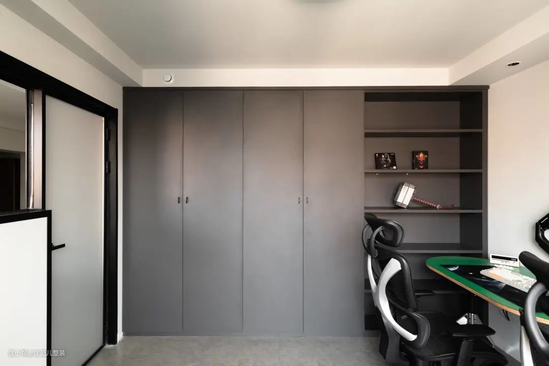 来到最后一个空间,次卧,一眼看上去,空的很。 除了沿墙而做的整面灰色定制柜,就是两台电脑的办公区。小夫妻两一人一个,都有位置。 按照小王的规划,这里故意没做大面积设计,东西也没买全,就是[留给未来的]。 从租房子到两人的婚房,不论是当下暂时的二人世界,还是要迎接不知道什么时候到来的小生命,两人心态上都有了准备,没来,做好自己,来了,重拿责任,不断做加法,爱好也会做出一些妥协。 我很赞同他们的想法,过好当下,也对未来有所期待,落实到设计上,从来都不是一步到位的,设计为人服务,不是被所谓的“设计”牵着鼻子走。 说实话,我采访的每一任屋主都很有自己性格和生活态度,每一个家的设计都承载了他们的理想生活。 与其说我在采访,不如说我在听他们讲故事,故事背后,有蛮多感人的细节,在浓缩的半天一天里,我以旁观者的身份向你们学习、交流,甚至快速参与你们的生活。 我受益匪浅的就是,不管你处于人生的什么状态,什么阶段,[好好生活]最重要。 看的过瘾,就点赞、收藏起来吧~下周六见!