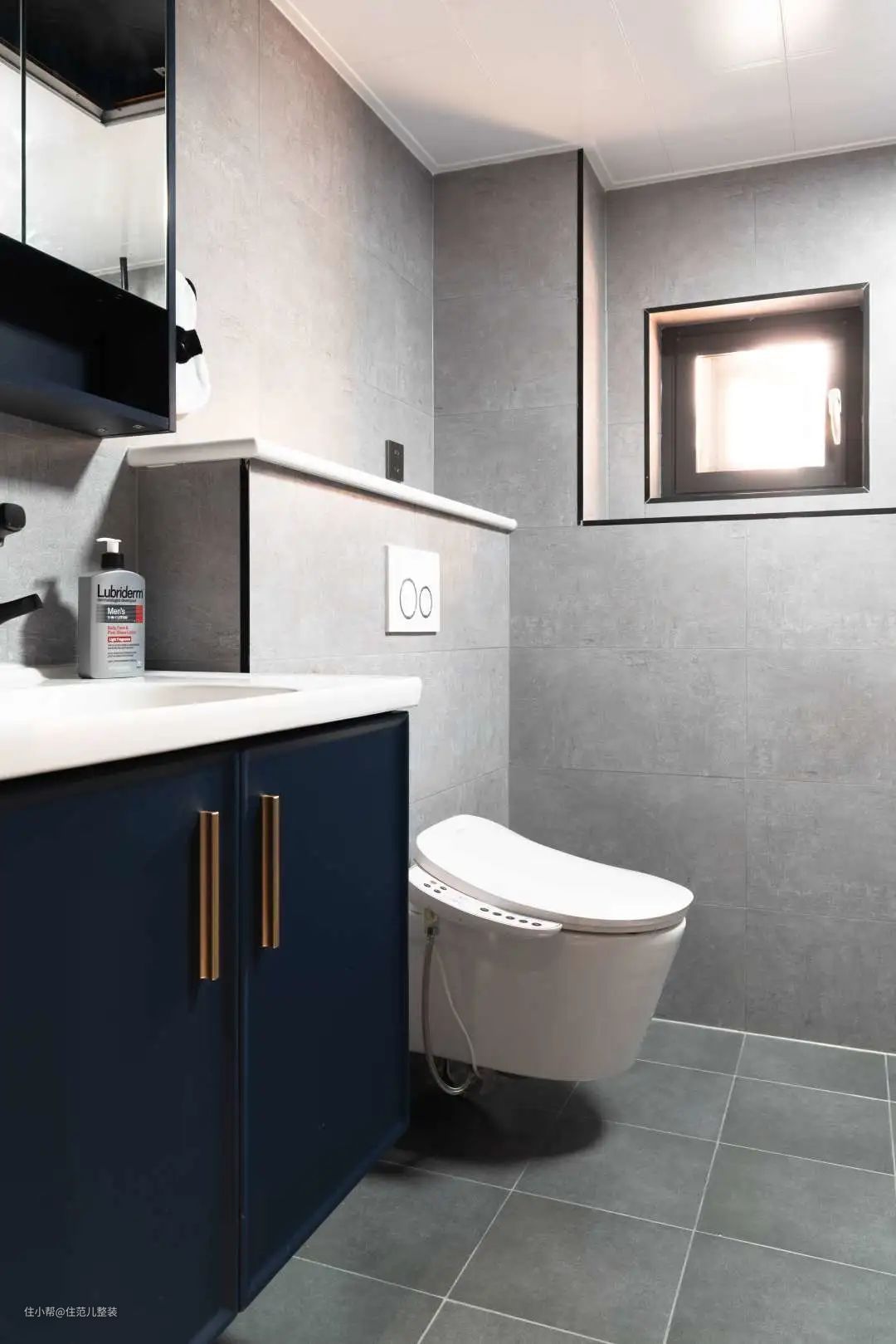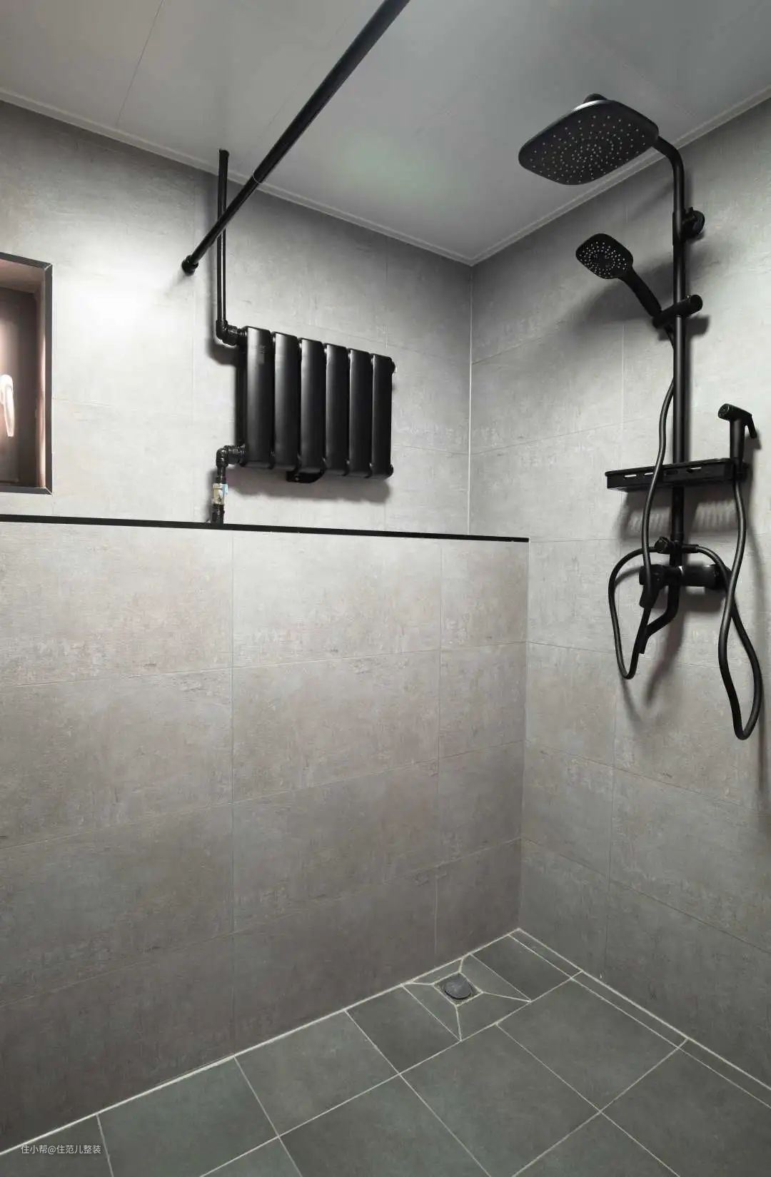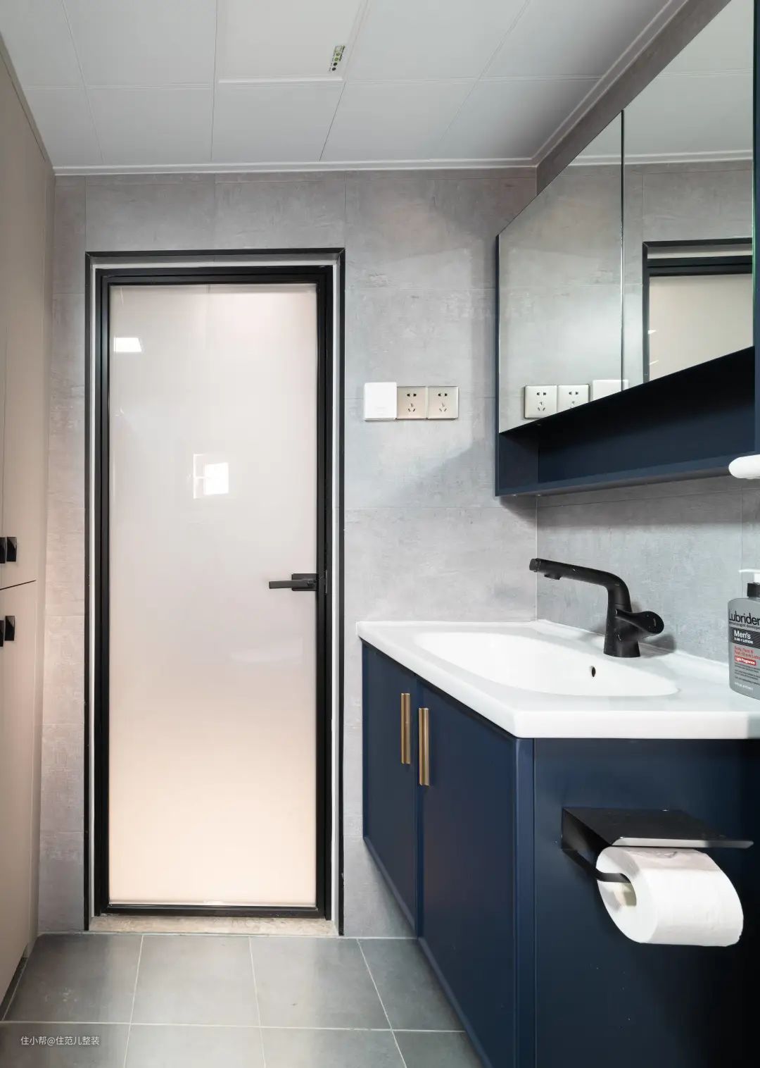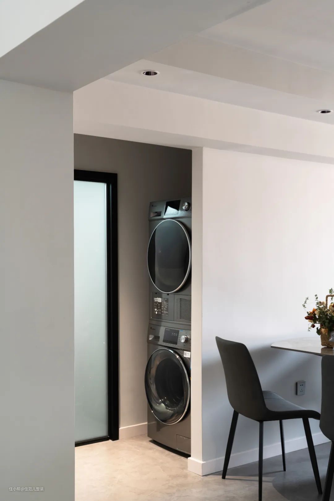 从主卧出来的隔壁,就是卫生间。 卫生间的位置并没有变化,变化的重点是与次卧连接的这面墙,改了次卧门的朝向,向次卧借了30公分,俯视角度看,做成"S"型,兼顾了卫生间、和次卧两个空间的需求。 朝向卫生间的这面,原来次卧门的位置,打造成“家务区”,上下放置的卡萨帝洗烘套装解决洗衣问题。 朝向次卧的那面,沿墙做一门到顶的收纳柜,收纳面积暴增,未来就算变成儿童房也不怕。(有娃之家最怕收纳) 家政区里面,是卫生间。卫生间一共也就4㎡,用移动的帘子隔开,下有2cm高的挡水条,就有了干湿分离。 干区是马桶和洗手台,湿区是淋浴区。 风格上与整个空间保持了高调一致,墙上用灰色大砖,地上用小的瓷砖。 卫生间门的背后,还有个套娃式的门,这里面是整个楼层的公共下水管,因为是顶楼,这个管买的时候就带个槽,很难用传统的方法遮住,为了后期方便检修。 设计师干脆把这里单独隔开,里面做了两组定制柜,用来弥补卫生间没有收纳位置的缺憾,同时遮住了丑陋的管道和水槽。
