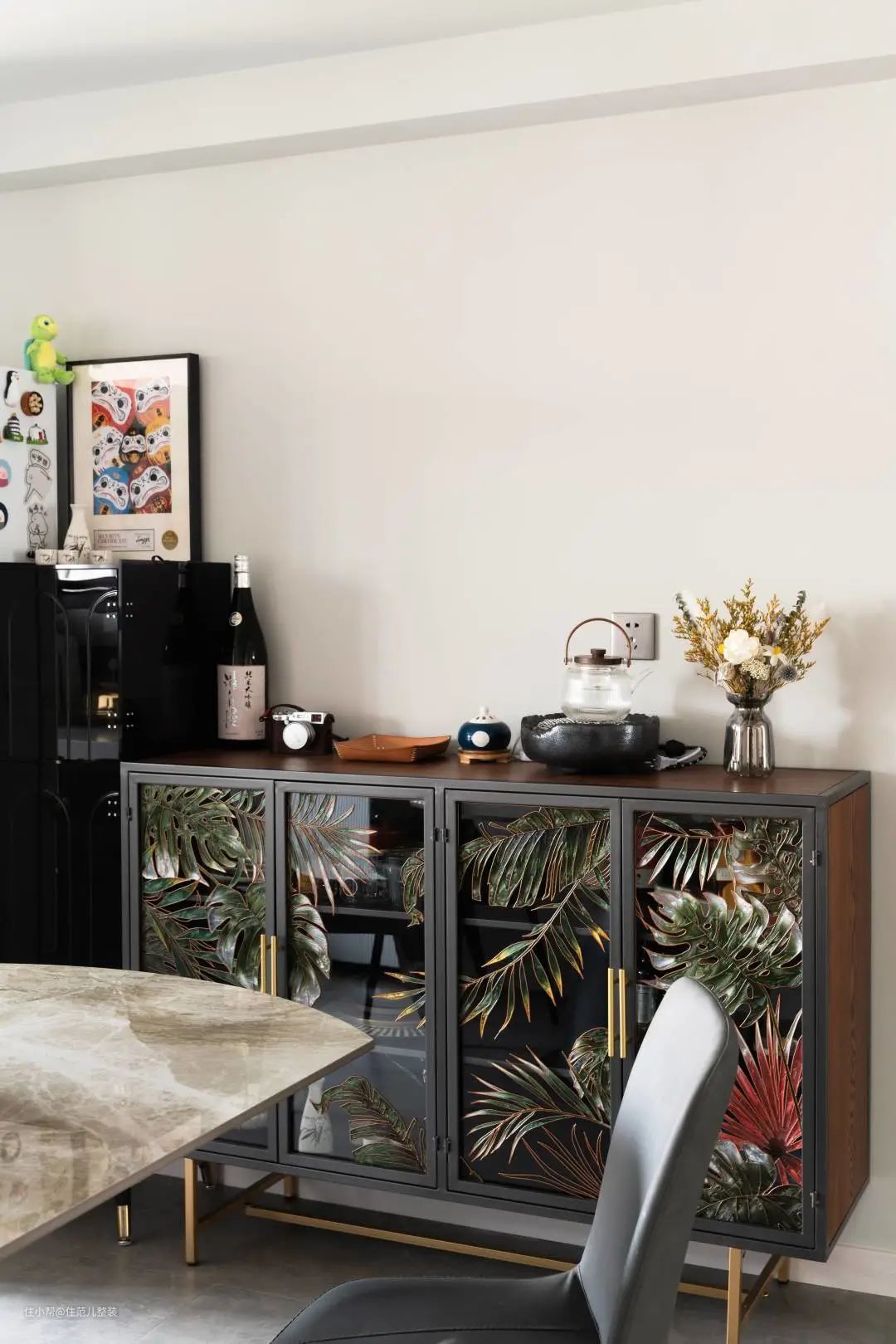 圆桌顶上,为了和工业风适配,小王特地选购了金属元素极重、且有棱角的吊灯,我没记错的话,这款灯是包豪斯风格的典型代表,用镀铬工艺制作。 餐桌旁边也是他特地网购的印花玻璃餐边柜,里面是两人的餐碗盘叠,上面刚好放出门要收纳的杂物,很方便。稍微有点小bug的是,这个餐边柜门不好开,还有噪音,准备入手的可做参考。