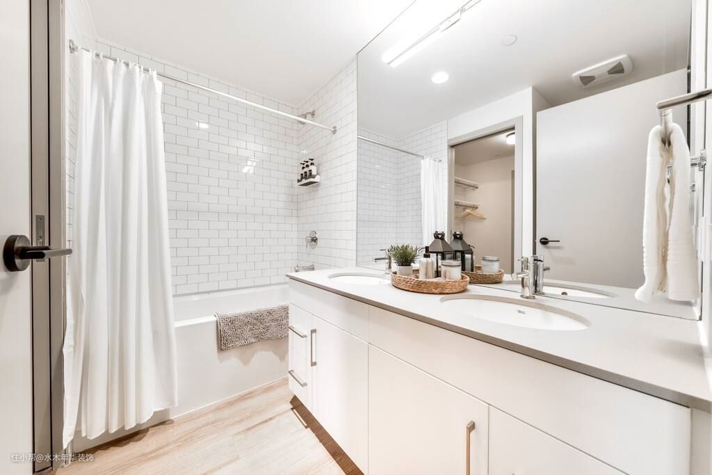 卫浴空间采用了大面积的白色为主色调,奠定了空间色彩基调,为了让浴室空间不会太单调,选择用原木色做点缀,就能增加空间的层次感,打造出不一样的浴室空间~