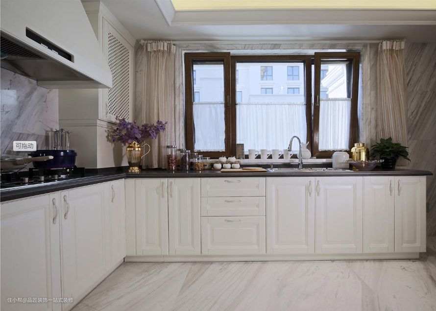 厨房中通铺大理石防滑哑光地板砖,法式风格的橱柜,使用温馨简单的奶油色系营造出法式感,整体上给人以放松的感觉,精致的厨具使人对烹饪更加期待,与房屋主体风格相呼应。