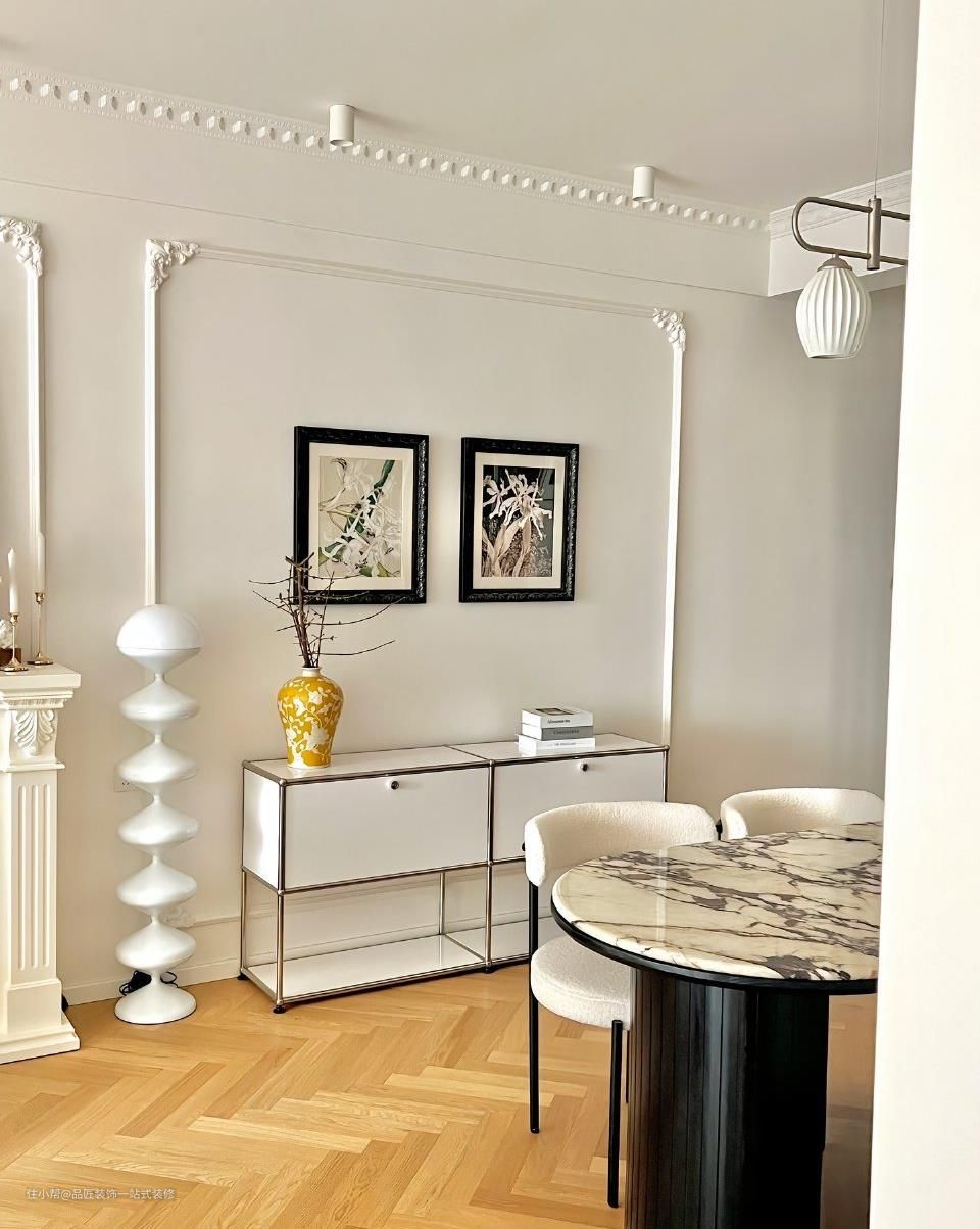 客厅以客厅相连,也采用鱼骨木地板通铺,使整体更加和谐,餐桌选用大理石高档餐桌,搭配皮质黑白经典配色的餐椅,冷淡风的白色置物架,新颖的落地灯,都彰显主人的品位。