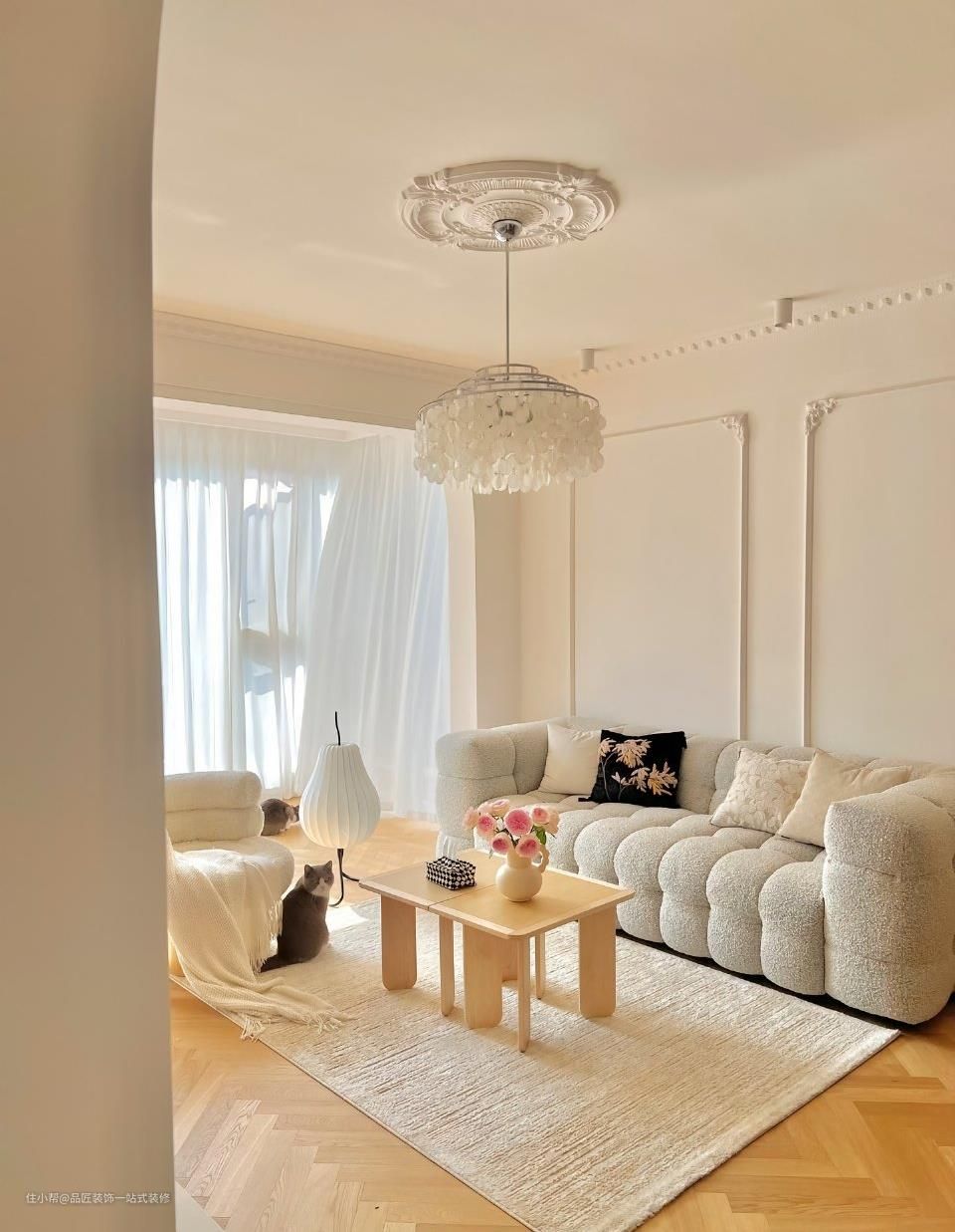 客厅中鱼骨木地板通铺,纹路自然清新,脚感舒适,天然环保,铺上白色奶油风格地毯,毛绒感松软大沙发,精致的法式吊灯,宫廷风格吊顶,阳台上洁白的窗帘,整体充满法式感。