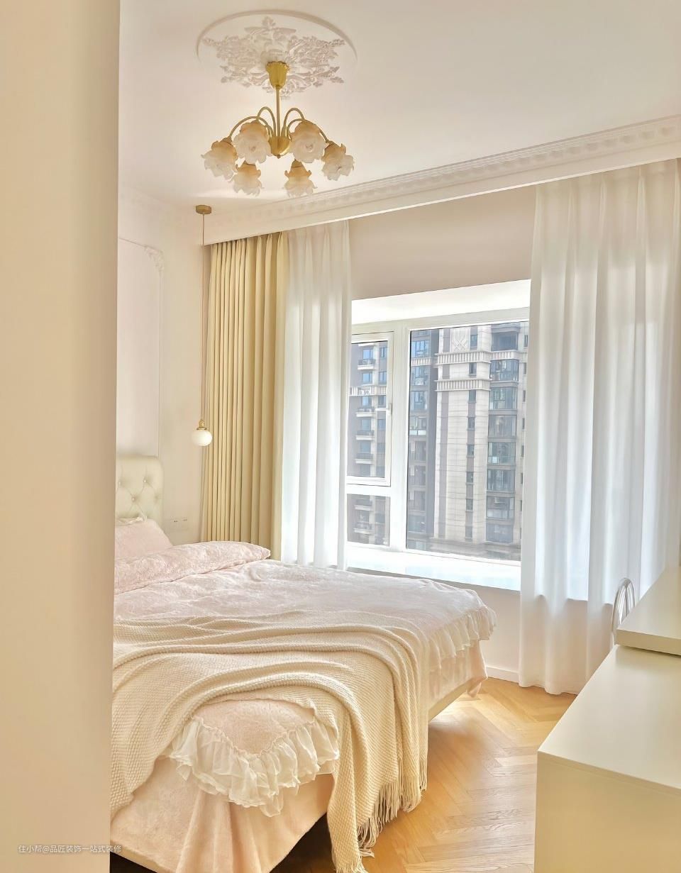 卧室正也是鱼骨通铺,木地板最适合用于卧室中,噪音小,不会影响睡眠质量,浪漫的床品充满公主气息,洁白的窗帘,大大的落地窗增加室内采光, 同时还能更好地欣赏窗外美景。