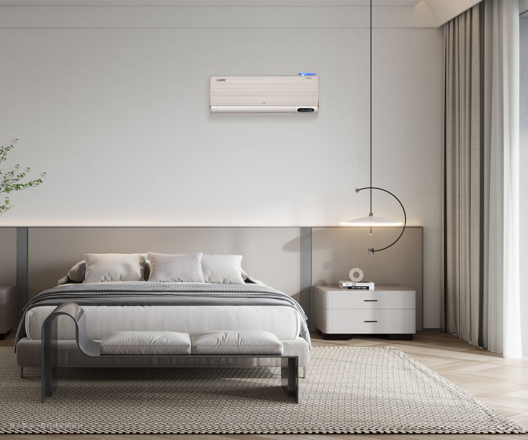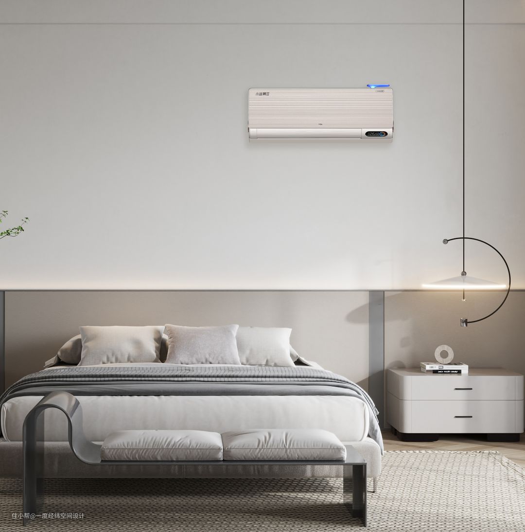 主卧在二楼,主卧内设置了阅读区,设计师把原本的墙体拆除,设置了暗门,把定制柜子内嵌进去,外面再以木饰面遮盖,让整个墙体更加完整。定制书柜搭配充满设计感的灯光,时尚与文化在此交融,写作与休闲为一体,沉浸在书香世界当中。 对面就是休憩空间,主卧整体空间留白,皮革与不锈钢的床头背景墙,简约的床品成为了主视觉,TCL新风空调小蓝翼Ⅲ空调挂机3D仿布艺纹理富有艺术格调,为卧室营造一种大气的视觉效果。 这部空调是业主新选的一款空调,由于大人带小孩一块休息,为了给宝宝营造一个健康舒适的呼吸环境,业主选择了这款空调。这款空调不用二次打墙孔或扩墙孔,安装孔径直径为63mm,和原空调的孔是相同的,不用担心破坏新家墙体。 业主对生活品质要求很高,对居住环境的空气质量也是非常重视,尤其是刚装没多久的房子,空气中难免会有一些残余的有害气体,业主对此格外担心,总害怕家人变成“肉体空气净化器”,遭受污浊空气对身体产生影响。刚好这款空调有个神仙功能可谓是”对症下药“,完美的解决业主的困惑。它内置TVOC气体传感器,可以实时检测多种居家常见的有害气体,空气质量显示环会根据其所识别的浓度实时变化颜色。空气质量显示环上的颜色是蓝色表明空气质量为优等;橙色的就表明空气质量比较差,室内空气质量一目了然。出现「橙色警示」即可打开呼吸模式率先排出室内浊气,再将室外新鲜空气排入室内,改善空气质量。 这款空调有四种新风模式:呼吸模式、新风模式、排气模式和内循环净化模式,非常适合刚装修完的用户。 呼吸模式:室内如果出现高异味,TCL新风空调小蓝翼III先排再吸,除去室内的异味,让卧室空间更加清新!它有60m³/h大新风量还有30m³/h大排风量,一呼一吸双向换新风,空气更清新!这款空调能轻松解决室内异味的问题。 新风模式:要是遇到室内憋闷的问题,可开启新风模式,60m³/h的大新风量,对房间开展空气外循环,把新风引入室内,保持室内空气清新;晚上睡觉时开启新风模式,更多新鲜氧气有效提升睡眠效果。 排气模式:新装后的房子难免会有残余有害气体,会导致室内空气质量下降,需要开启排气模式,30m³/h的排风量率先把室内污浊气体快速排出室外,先把脏空气“呼”出去,优化室内空气质量。 净化模式:现在正逢春季,室外会有花粉柳絮或者沙尘暴、雾霾天的天气,不敢开窗户通风,就可以使用它的净化模式功能,使用新风内循环净化,清新室内空气。 悄悄告诉大家它还有会升降的小蓝翼新风口,一键升起就可以享受清新自然的新鲜空气,能导流风向,可以加速新风的输送,而且还能防止新风直吹天花板,从而避免对天花板造成一定的侵蚀。 如果是房间里有小宝宝,要注意不能让宝宝直吹着凉、不能忽冷忽热、也不能长期在高噪音的环境下成长。这款空调采用智慧柔风技术,“智柔风”是由14片柔风叶与1106个微风孔相互加持,能柔化气流输送轻柔风感,实现冷风不直吹,智柔风不着凉,防声低噪,细心呵护宝宝的睡眠。 TCL新风空调小蓝翼Ⅲ双向换新风,呼出室内浊气,吸进室外新风,四重过滤系统保证为室内输送的是健康新风,让家人尽情生活在舒适鲜氧满满的空气环境中。相比于传统新风空调只有新风吸气一种模式,小蓝翼Ⅲ通过吸排的组合方式,功能更强大,真正实现了“空调会呼吸,空气更清新”。你是不是也心动了呢?快戳上面的链接看看吧!