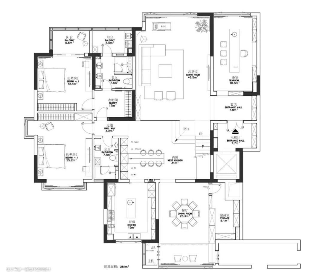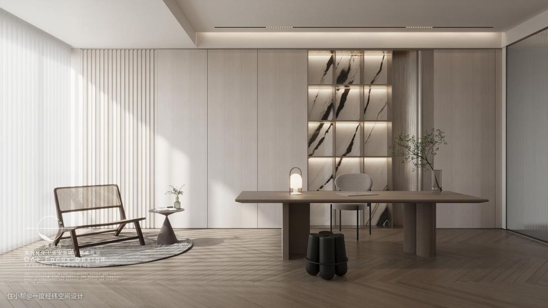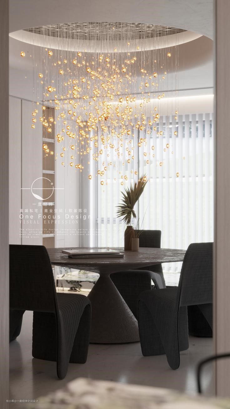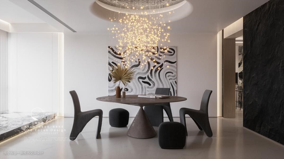 餐厅的区域大部分墙面没有做过多的造型设计,而在门口处的墙体以粗糙的石材做了反差,与整体空间形成强烈的对比,显得整个区域精致而大气。后现代的挂画,让整体呈现厚重感与雍容感。 由于门后面有一个消防楼梯,设计师做了抬高处理,自带奢华气质的大理石为空间缔造出层次感.。 设计师在此做了建筑的设计手法,白色的墙面一直延伸到天花。在天花上做了一个圆形的造型,圆内呈反光灯槽和水波纹的镜面,在灯光的折射下,星光点点、繁星璀璨,让整体空间更富有灵动性。