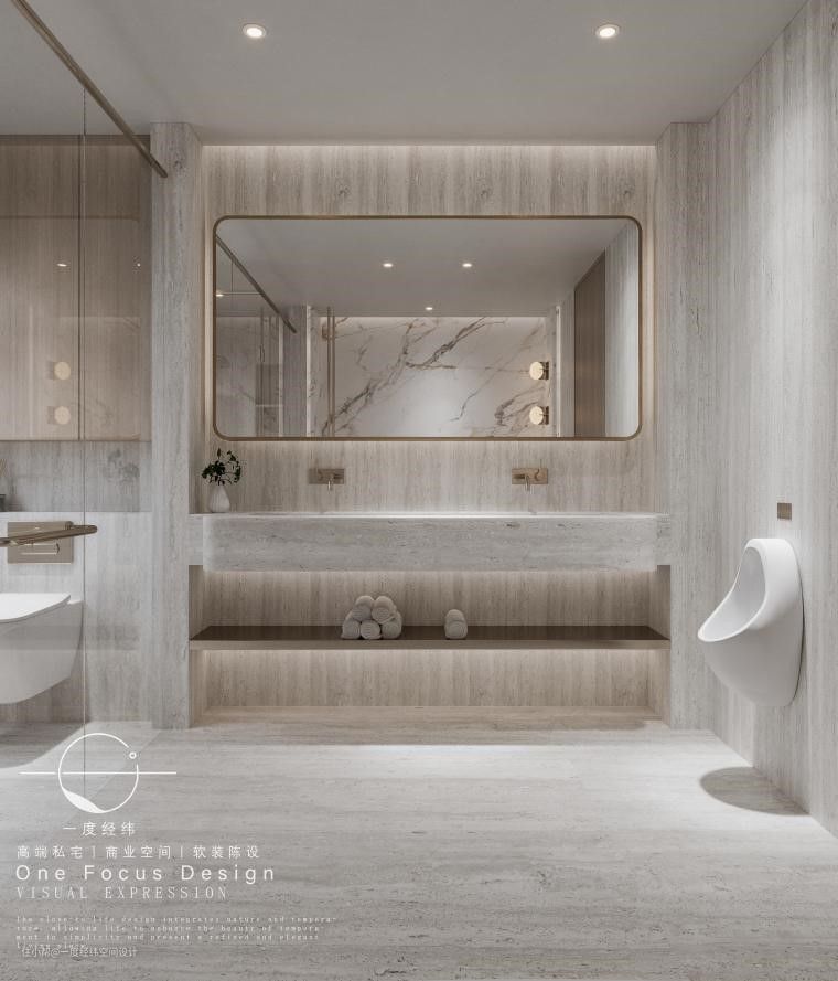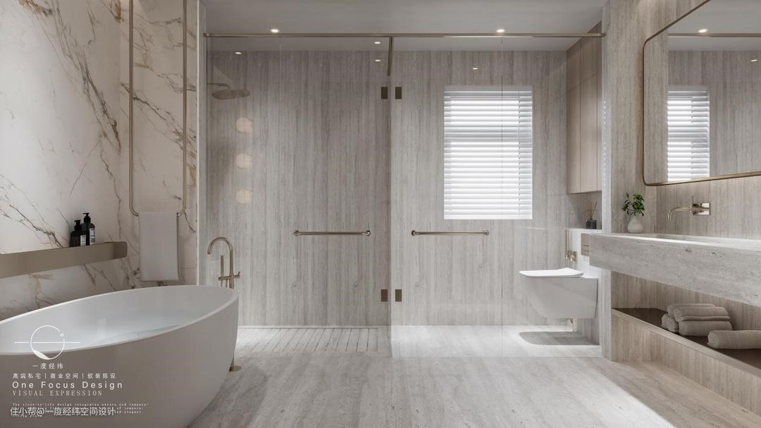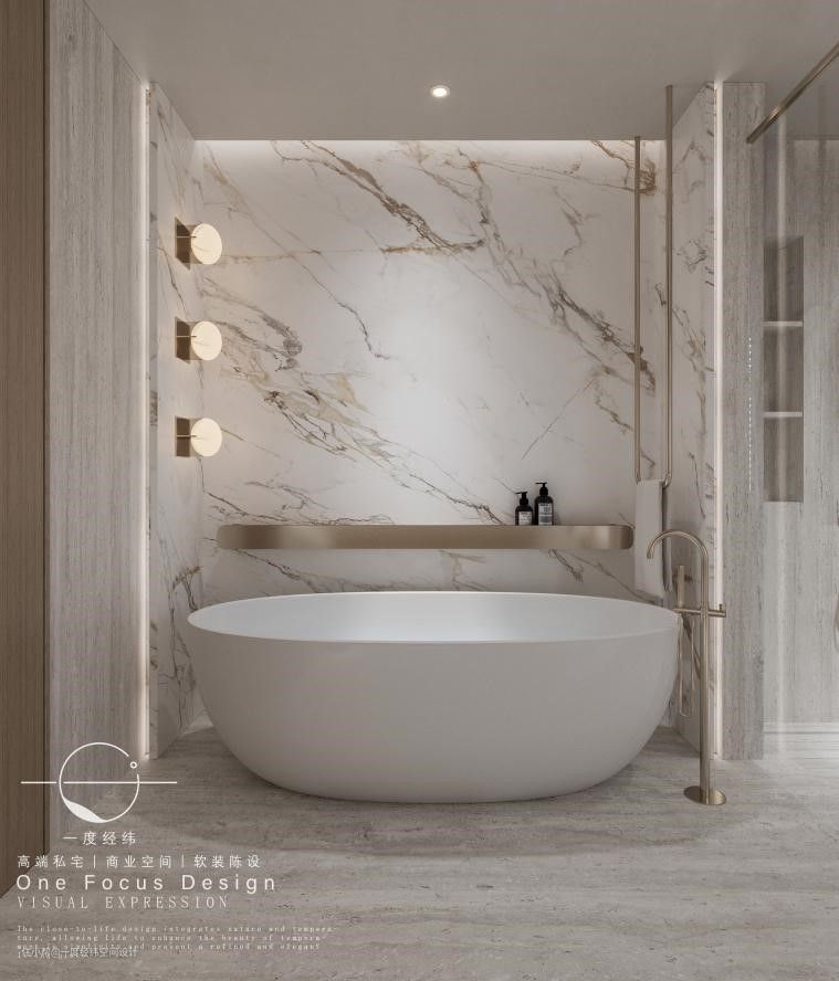 主卫采用了浅层岩板,纹理自然的大理石元素。浴缸背景采用轻奢的高档石材结合金属做出的造型,柔和的灯光相互碰撞带有一丝令人着迷的精致感,营造舒适高贵的空间氛围