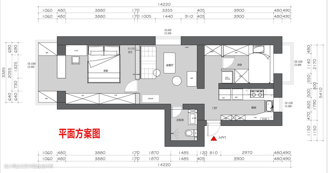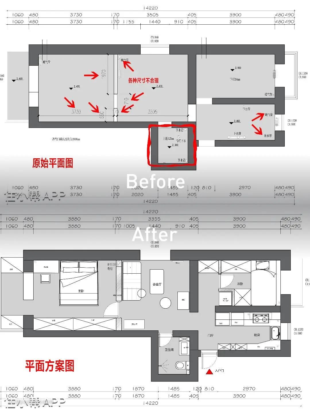此案最大的优化点:格局不变(见上图),调整室内细节尺寸,让空间更大,合理,再满足使用需求的同时,释放了大量的空间,利用客厅和主卧室的共墙错位,把原本很丑的管道美化了。