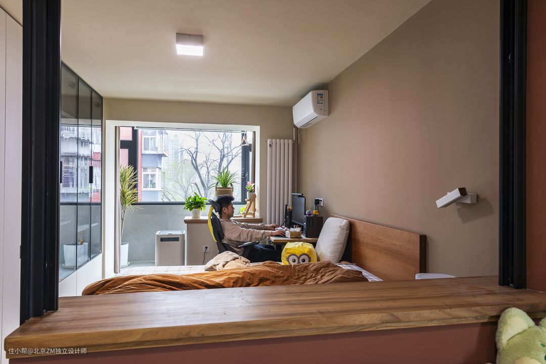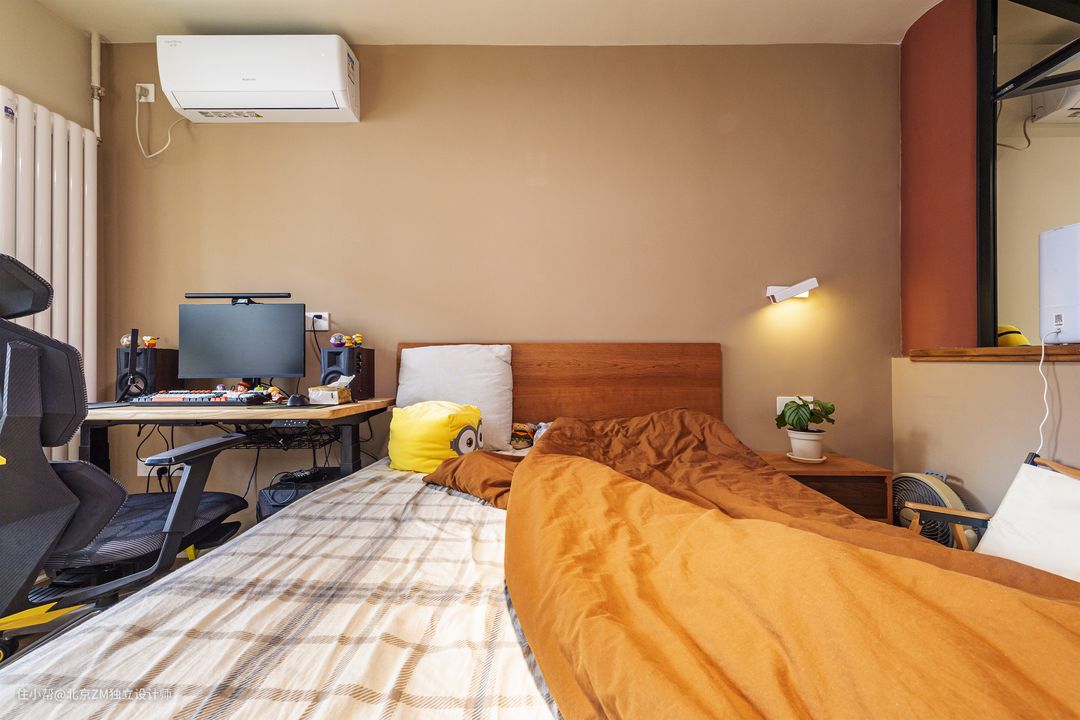 次卧前期充当储物间,后期可以做客房使用,满足储物,办公区和放双人床的尺寸,次卧虽然平米小,搭配暖色系的造型,内嵌空调看上去更具有轻奢风,选用亮面的窗户门板。