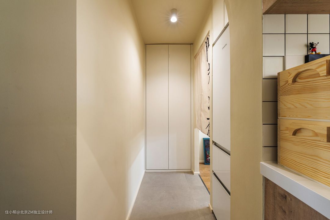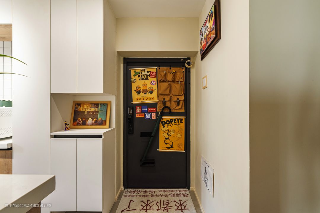 利用入户门的面积,把非常规尺寸的小物件挂门上,节约柜体空间。 过道柜体是杂物清洁柜,内置电源,方便戴森等用电清洁设备使用。