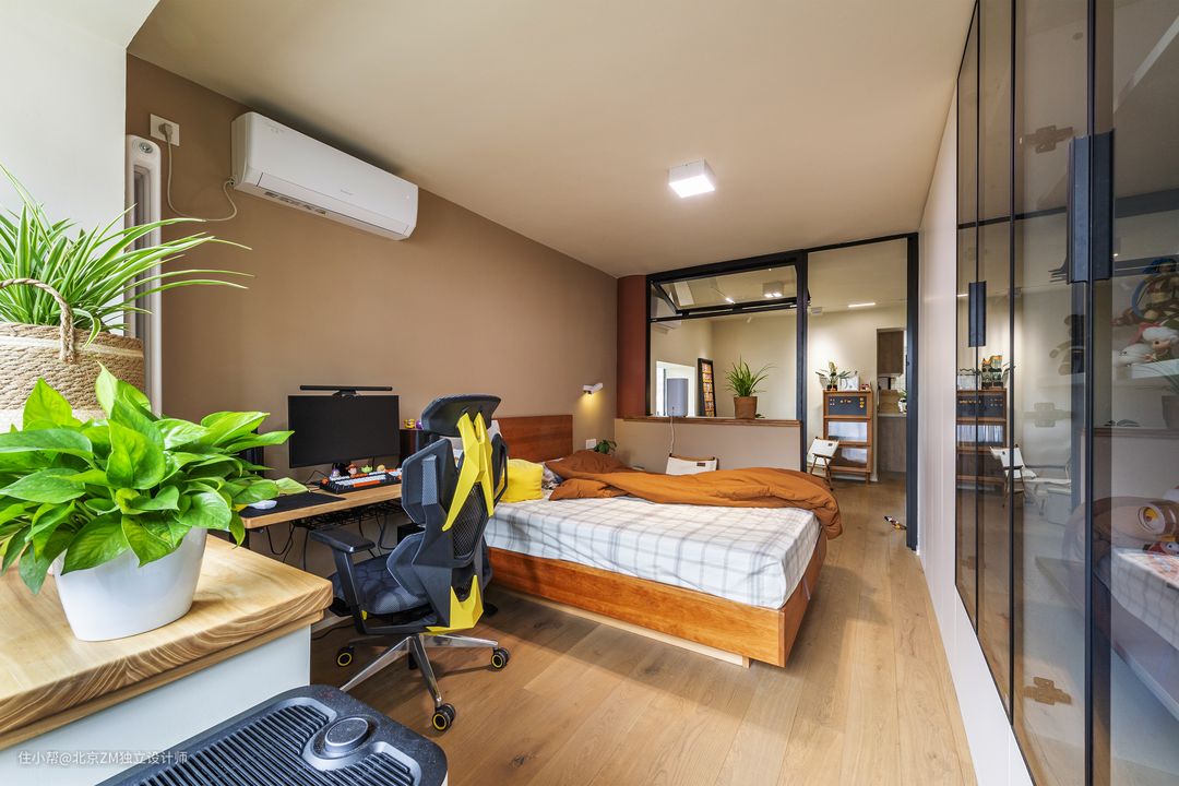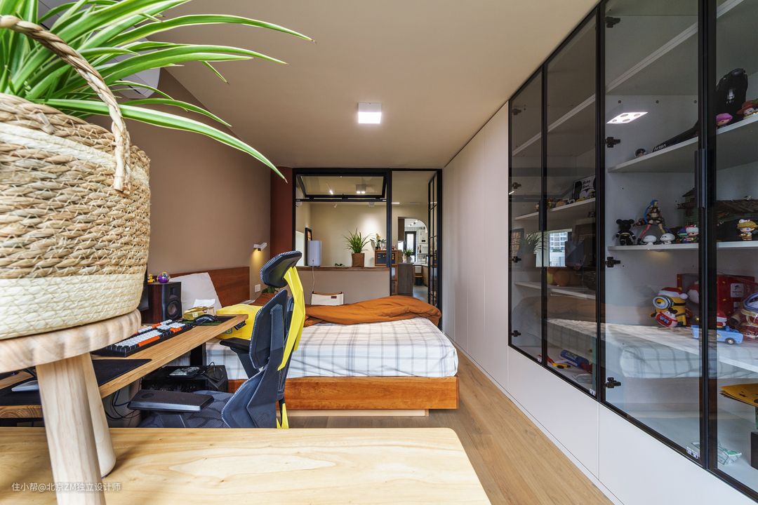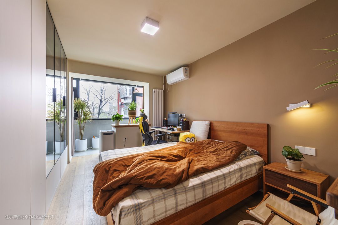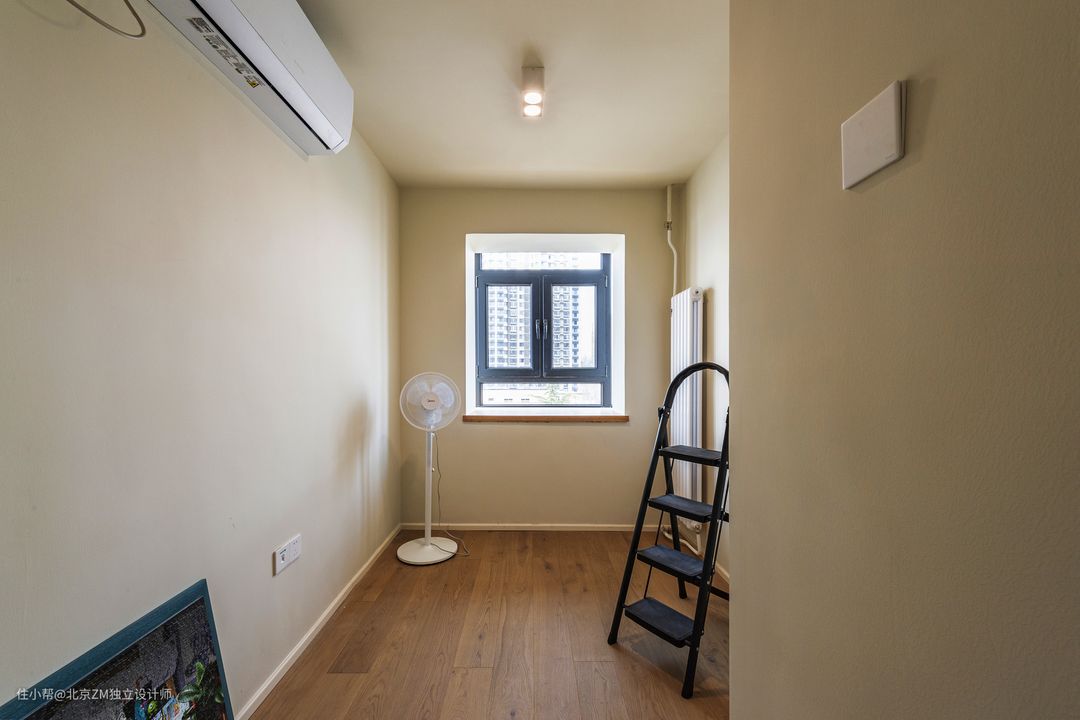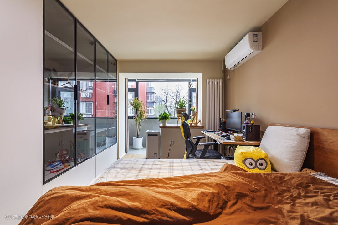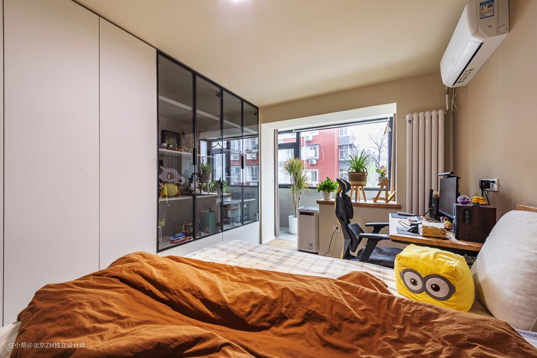 次卧前期充当储物间,后期可以做客房使用,满足储物,办公区和放双人床的尺寸,次卧虽然平米小,搭配暖色系的造型,内嵌空调看上去更具有轻奢风,选用亮面的窗户门板。