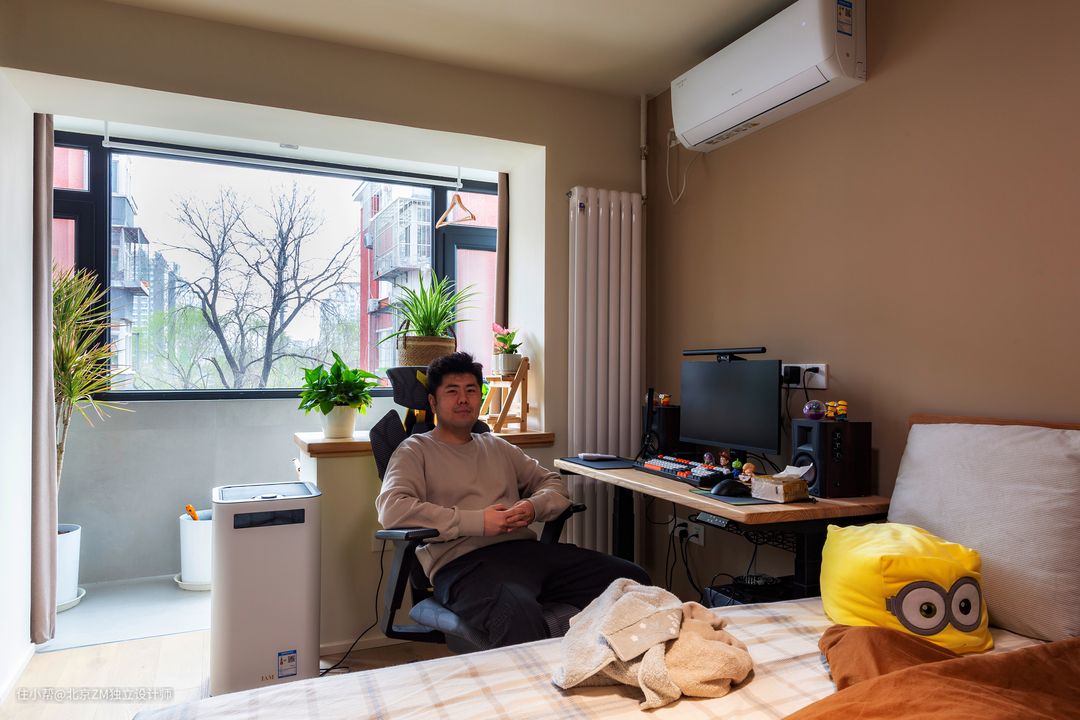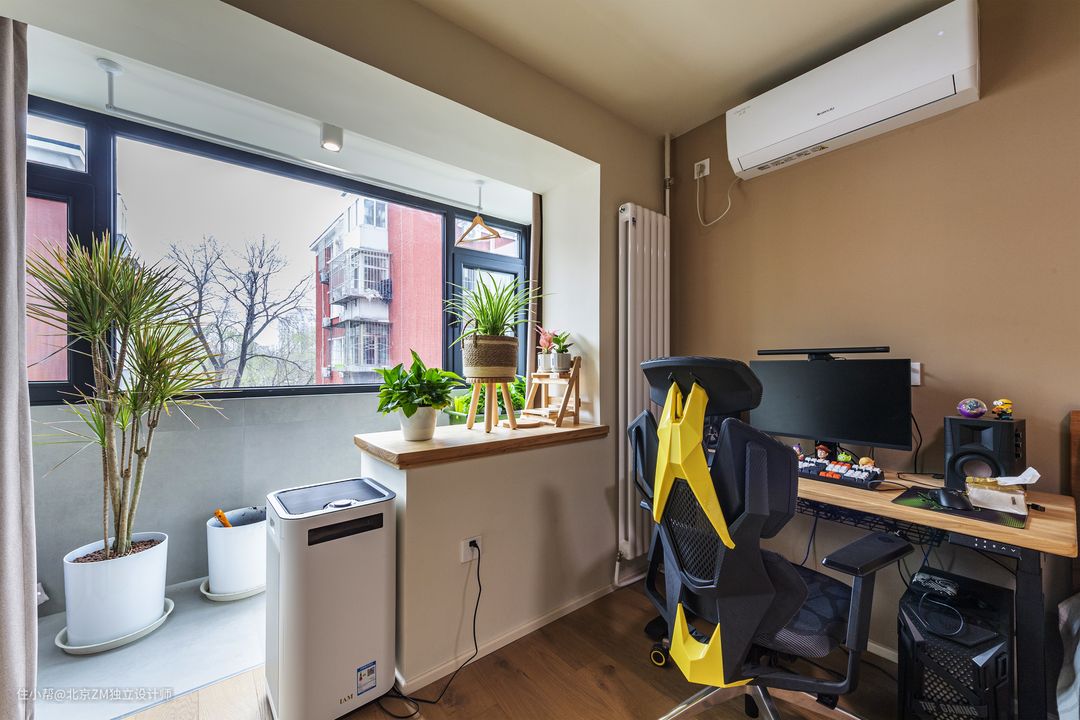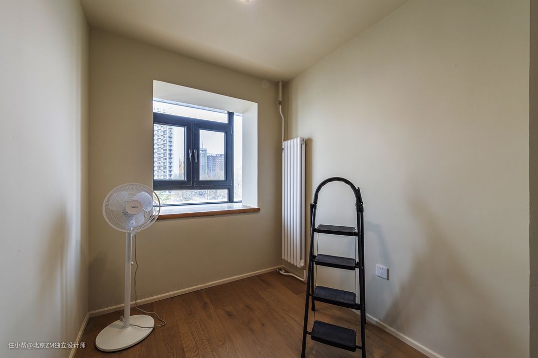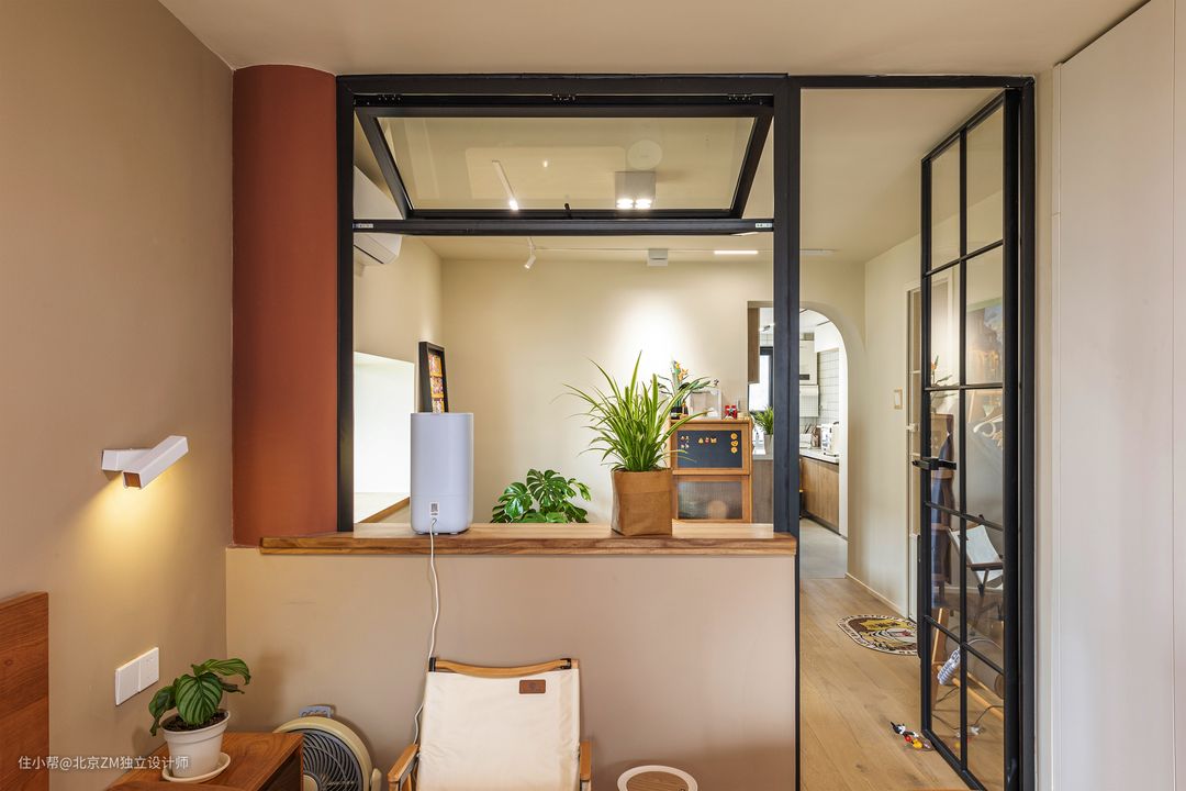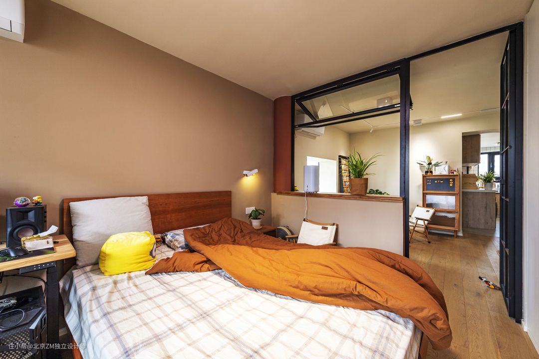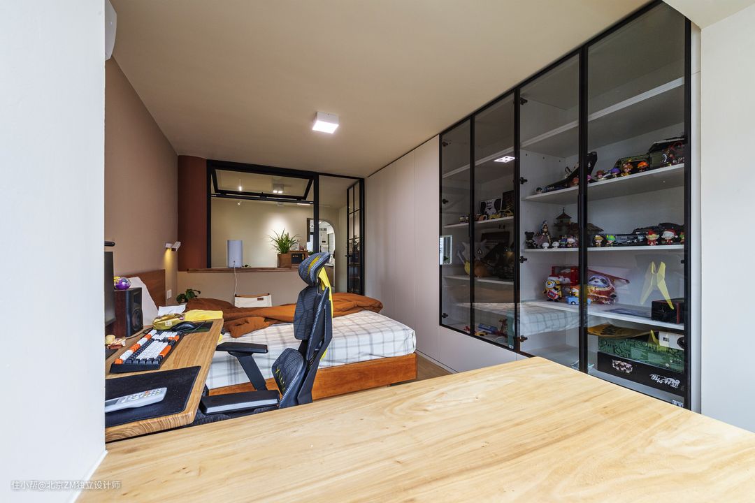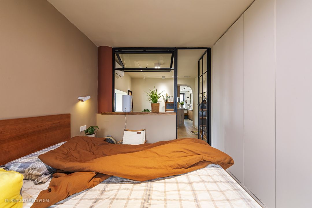 次卧前期充当储物间,后期可以做客房使用,满足储物,办公区和放双人床的尺寸,次卧虽然平米小,搭配暖色系的造型,内嵌空调看上去更具有轻奢风,选用亮面的窗户门板。