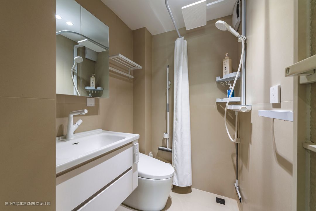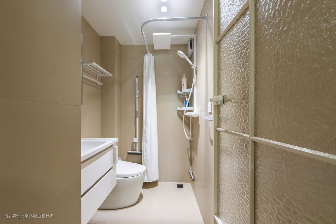 卫生间的基础配色整体大改造,扩大了原有的空间,整体颜色没有过多的堆砌,改造之后不会给人像原来那种狭小的范围,反而给人一种稳重的视觉感受。 卫生间改造之后通过施工工艺把原有的高门槛做平了,在不影响动线的情况下,合理安排,干区地面和墙面瓷砖颜色搭配协调。墙地面对接600×1200,搭配上同色环氧采砂,色调统一不杂乱,尺寸比较大。整体设计合理舒适,同时也将下水道隐藏起来,不影响整个空间的美感。