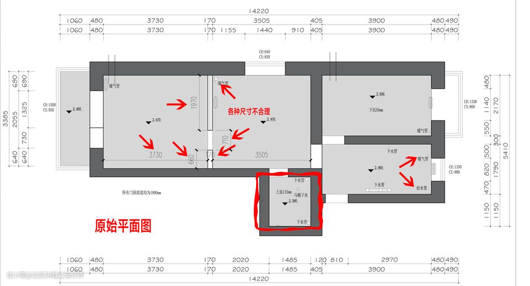 此案最大的优化点:格局不变(见上图),调整室内细节尺寸,让空间更大,合理,再满足使用需求的同时,释放了大量的空间,利用客厅和主卧室的共墙错位,把原本很丑的管道美化了。