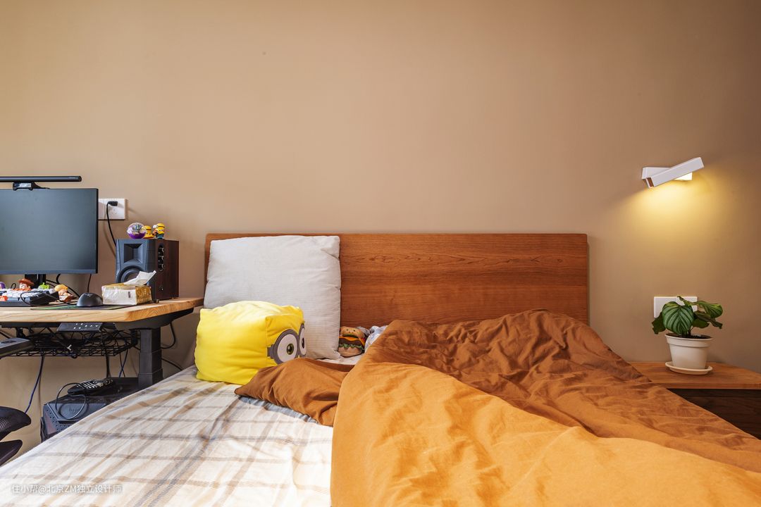 主卧背景墙是采用原木的饰面做的一个造型,中间内嵌了灯带,超大的宽度,床内嵌办公桌。床头柜的巧妙设计,使得整个房间显得非常的简约大方。衣柜的尺寸稍扩一下就使氛围感一下子提升了。