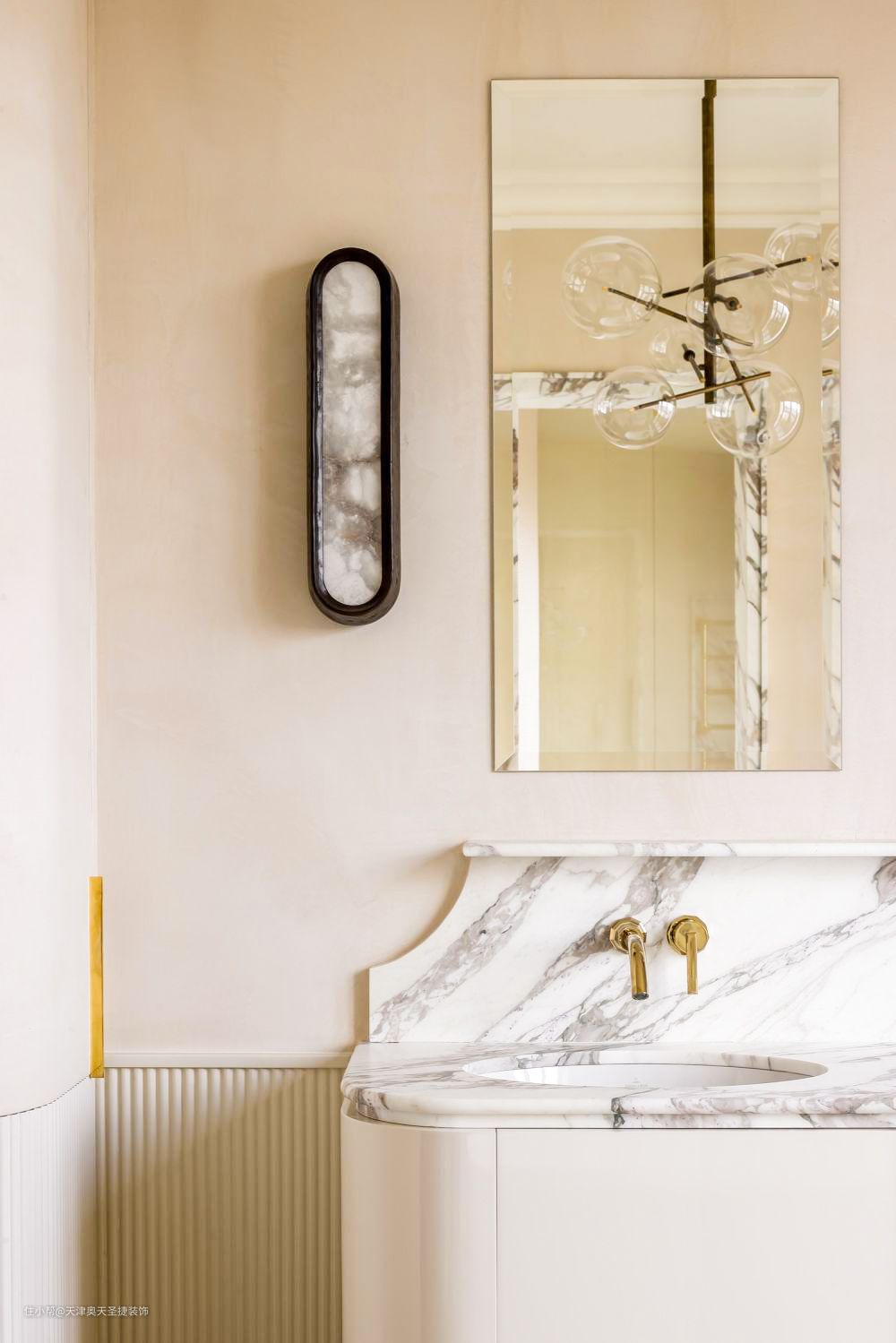 1、卫生间洗漱区墙面做了不同的设计,上半部分做了漆面防水处理、下半部分做了半墙的保护处理,洗漱台的台面为石材,台面做了乱纹及巧妙的缺角设计,会给人一种自热随性感,灯光设计为吊灯,这样设计空间的光线会明亮均匀,在空间中也会增添随性美 2、卫生间整体的设计形式为干湿分离