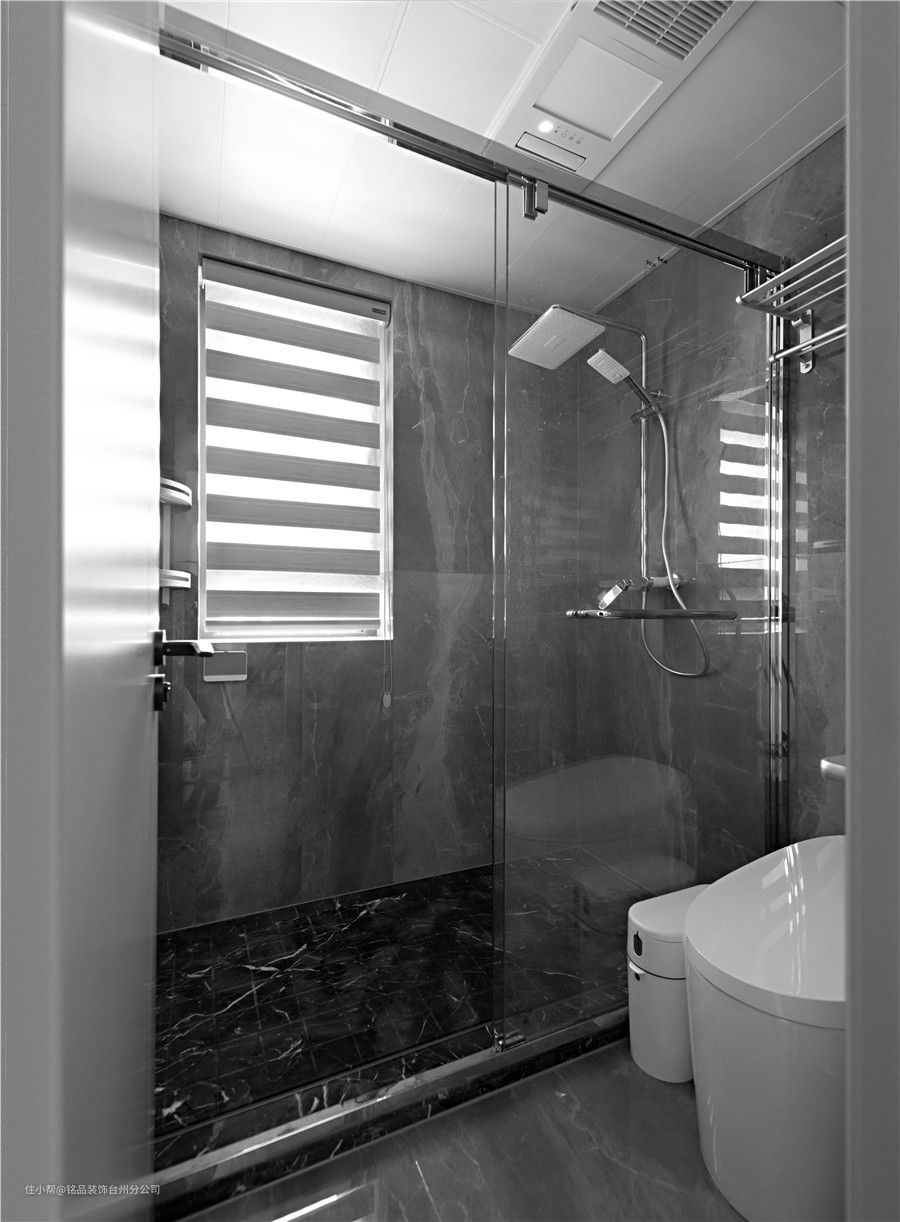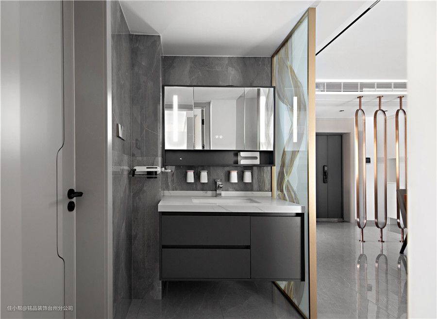 三分离布局规划的卫浴空间,打造出独立的洗漱区,镜柜搭配台盆柜,收纳力max,而且与内室采用半开放式隔断,金边奢华纹理的玻璃纹理,彰显出空间的灵动与高雅。
